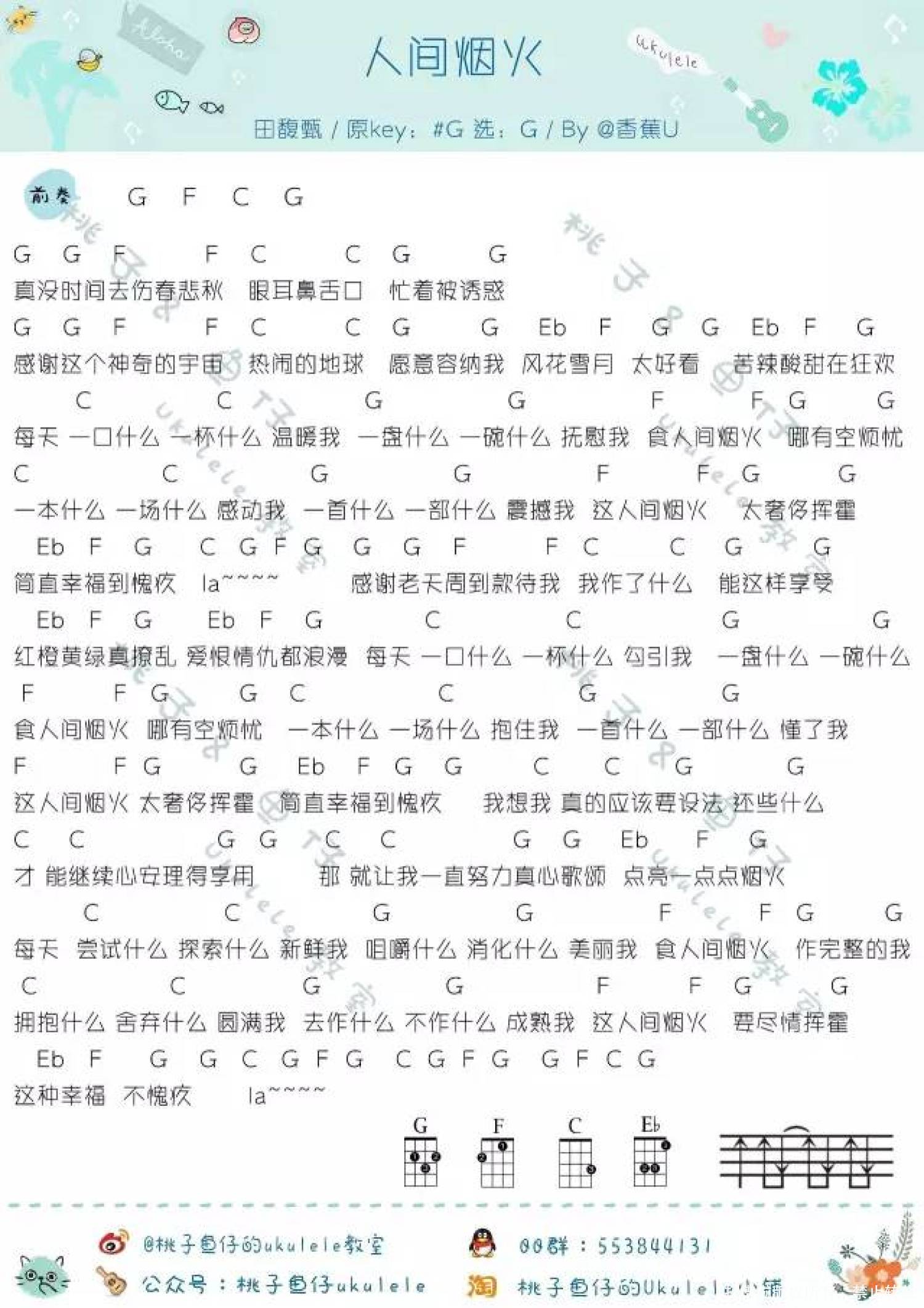 曲谱介绍: 俏皮魔性,具有强烈的个人色彩,《人间烟火》,关于的是“亲情、生活、食物、电影,一切身边的人与事,欣赏发现它们,都能得到乐趣;「食人间烟火/哪有空烦忧」的洒脱,再平凡的事物也能带给自己愉悦的心情,做真实的自己;“不食人间烟火,怎能打开胃口“感谢这个热闹的地球,愿意容纳我”“我想我真的应该要设法还些什么,才能继续心安理得享用”延续歌者一惯谦卑感恩的态度,感谢上天赐予的每一个日常。「人生就像烟火一样稍纵即逝,所以我珍惜每一个像烟火的瞬间,不管是一本书或一部好的电影,我都大量的吞食,就像一块好的肉,我会想吞食它。」人间烟火 尤克里里谱