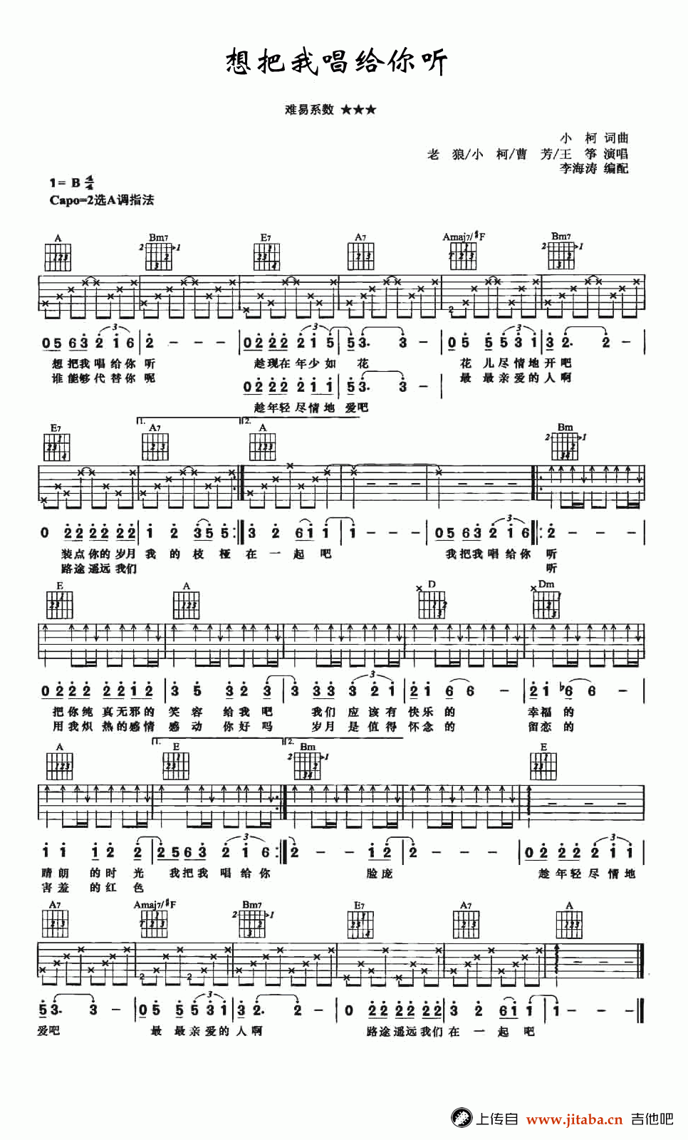 曲谱介绍: 想把我唱给你听吉他谱,想把我唱给你听吉他弹唱六线谱,原调B,选用A调指法,CAPO夹二品。《老狼的歌》是一首经典的旧男女副歌