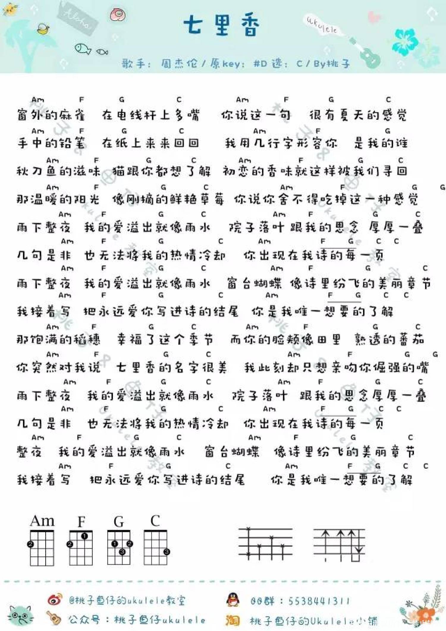 曲谱介绍: 周杰伦《七里香》_C调尤克里里谱