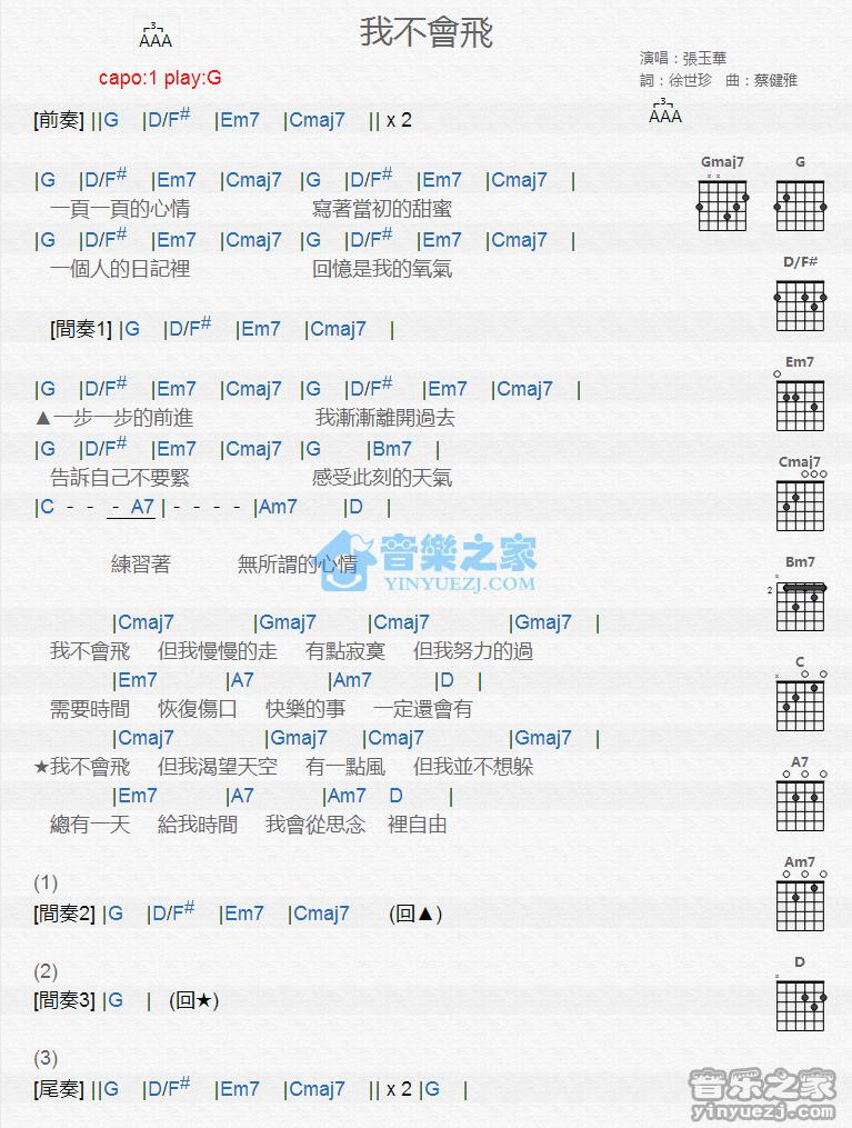 我不会飞吉他谱 - 张玉华 - G调吉他弹唱谱