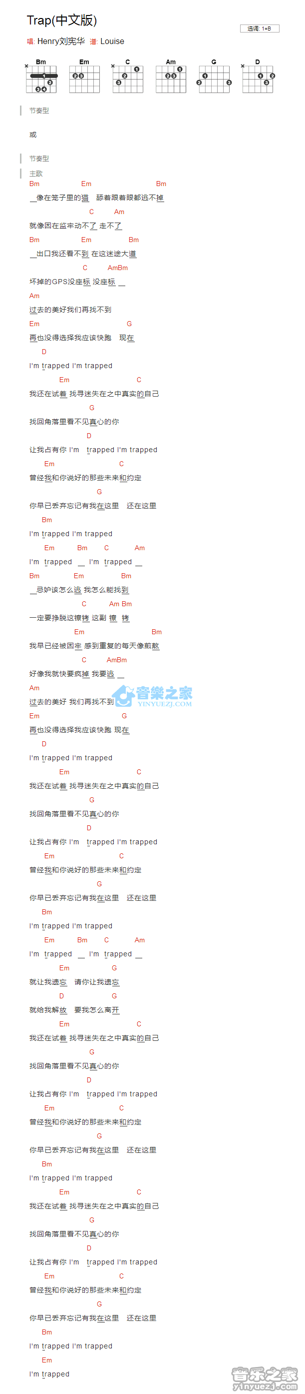 曲谱介绍: Trap 吉他谱选调B 刘宪华的一首歌曲, 和弦吉他谱,Bm和弦开头抒情悠长的一首曲子,喜欢的朋友可以试试