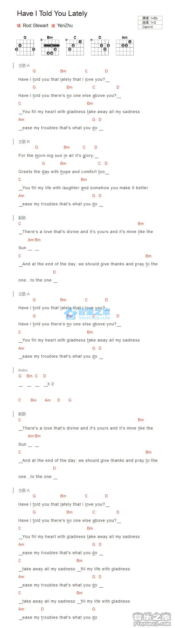 曲谱介绍: Have i Told you lately 吉他谱一首英文歌曲 Rod Stewart演唱原调Bb 选调G have i told 有 that lately that i love you? 一首经典的歌词请记住它。