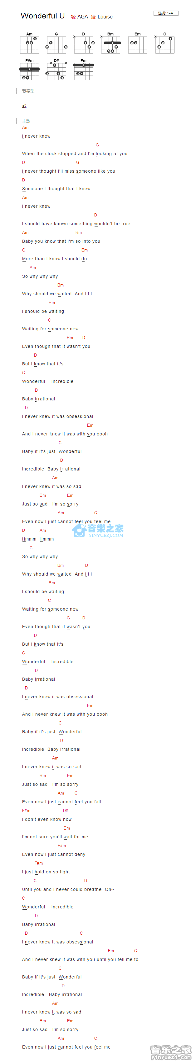 曲谱介绍: Wonderful U 英文吉他谱,Am和弦开始 喜欢的朋友可以试试 Wonderful Incredible