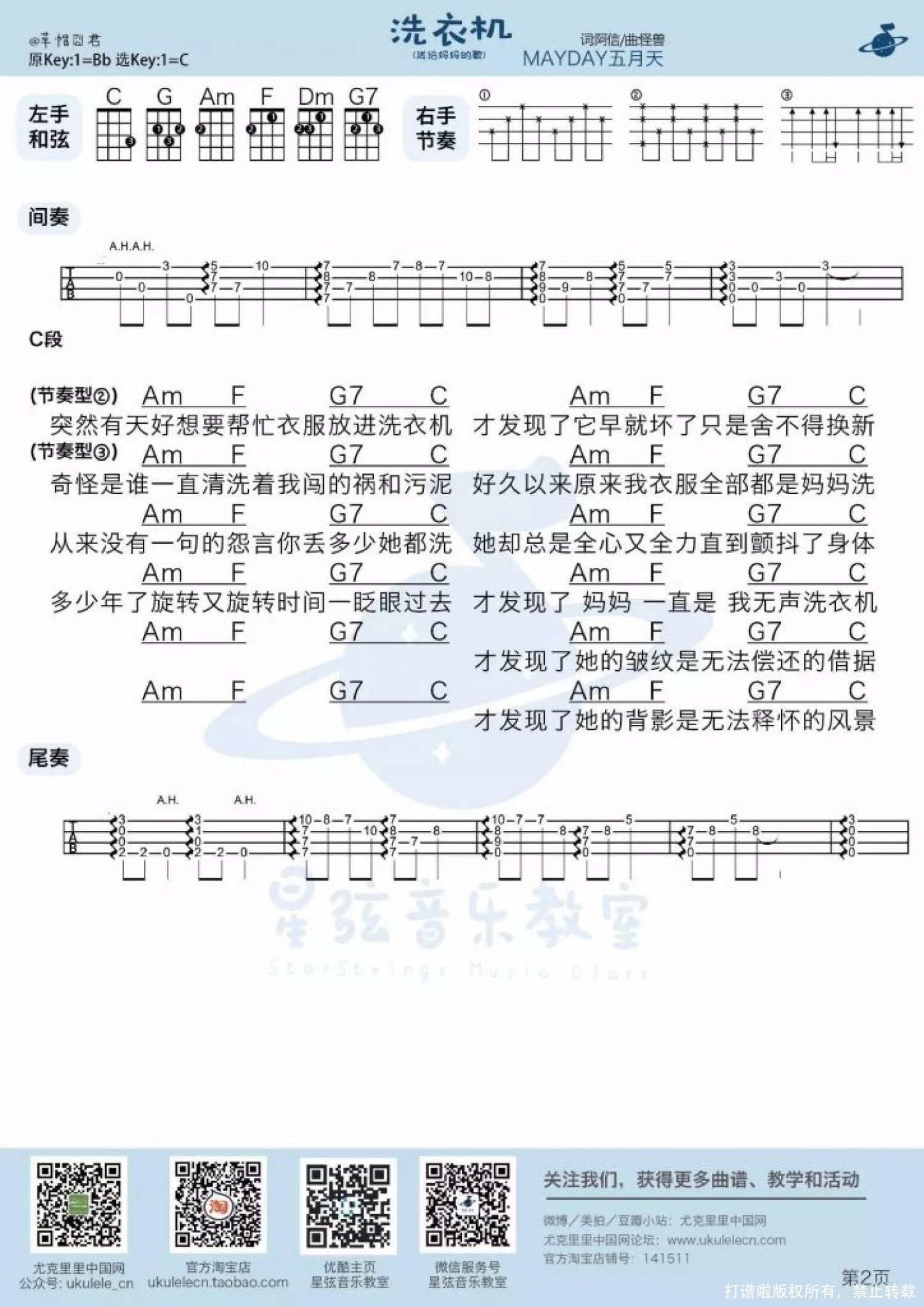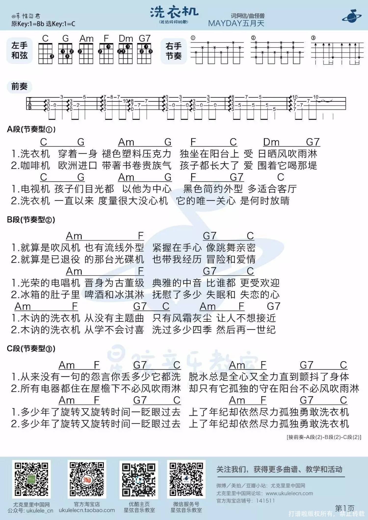曲谱介绍: 五月天《洗衣机》_C调尤克里里谱