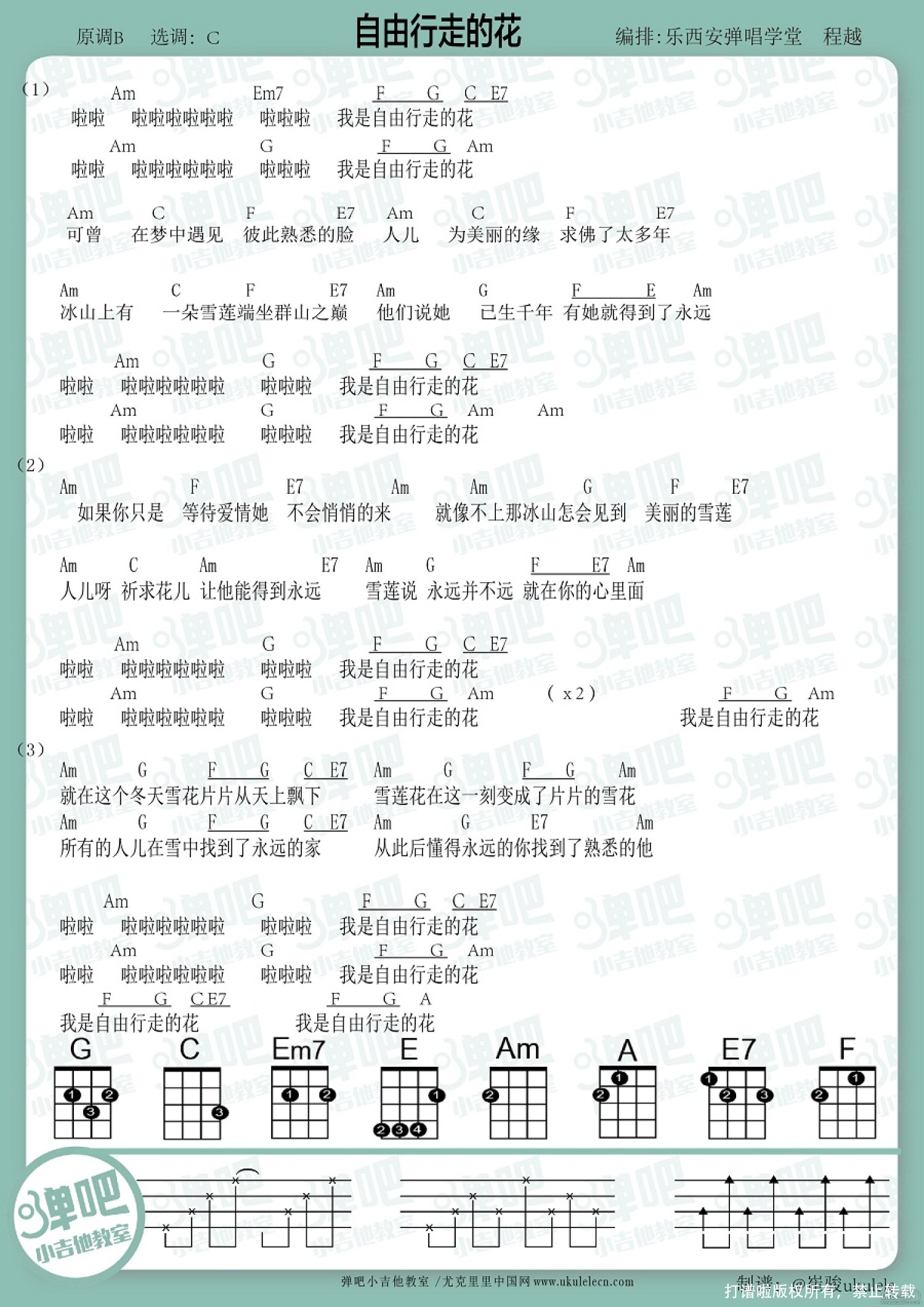 曲谱介绍: 萨顶顶《自由行走的花》_C调尤克里里谱