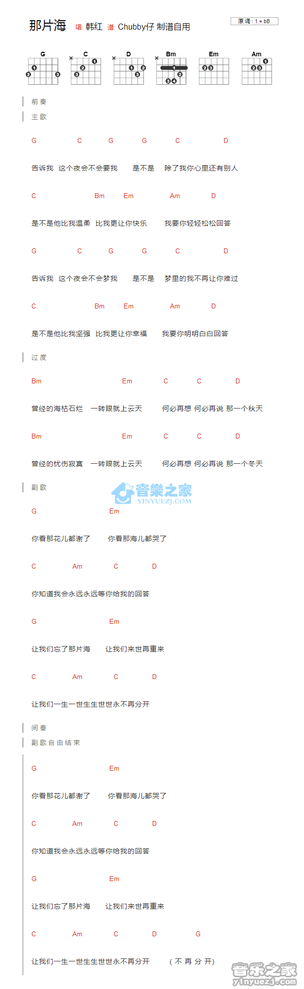 曲谱介绍: 那片海《那片海_》吉他弹唱谱,采用B调指法编配,共有1张高清图谱,免翻页排版设计。
