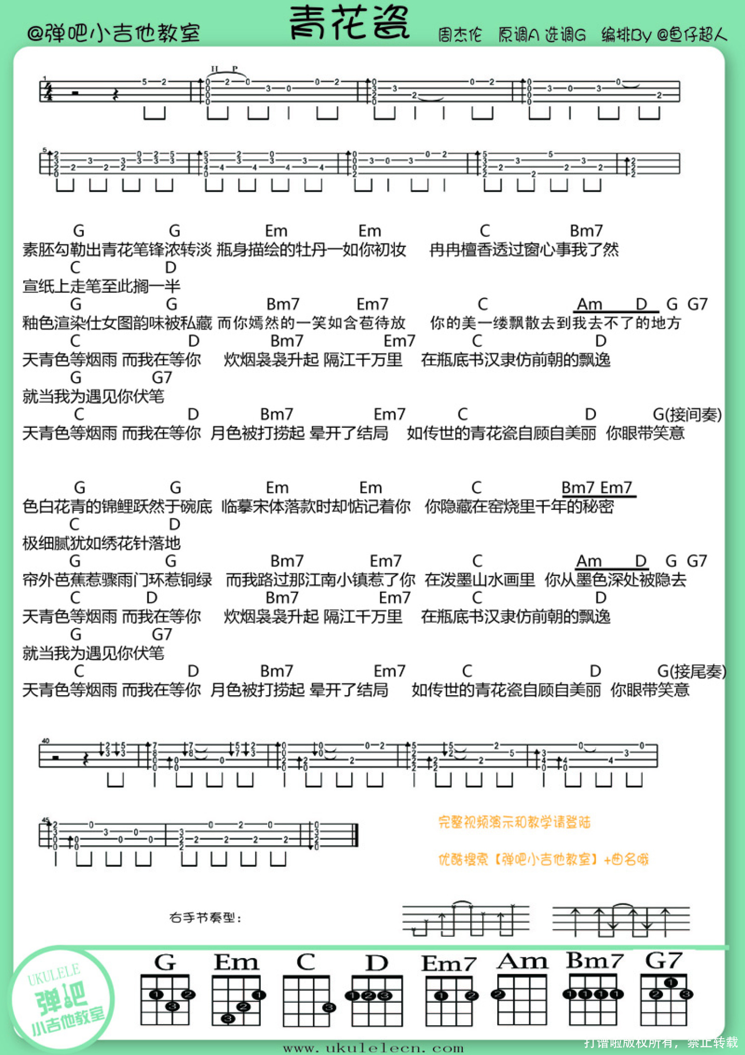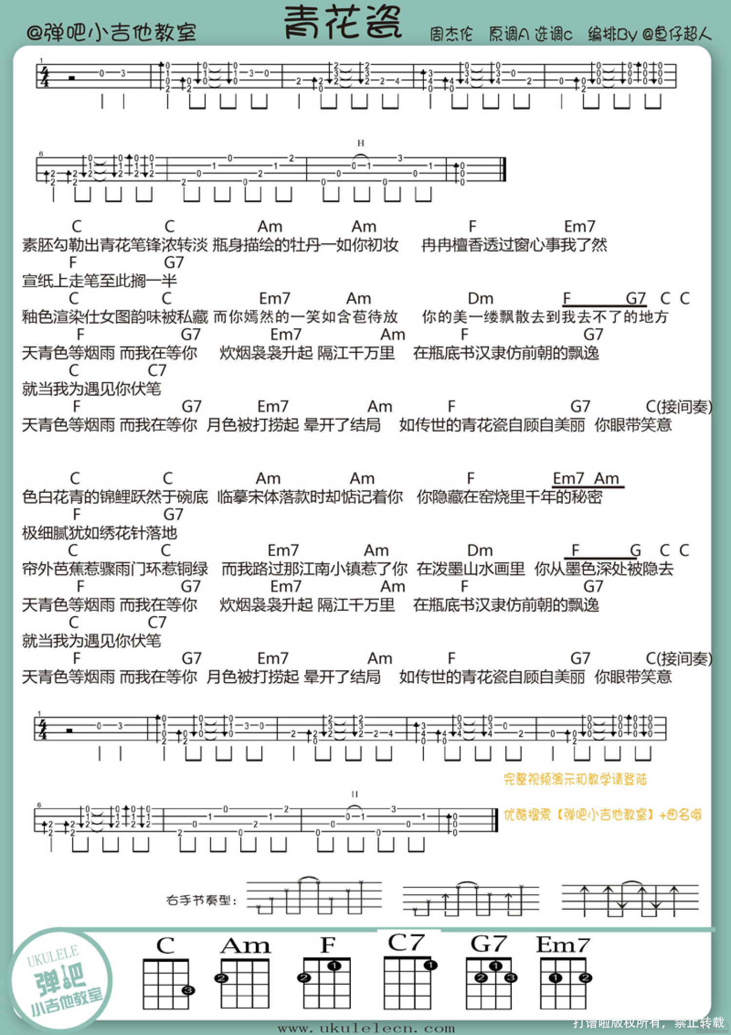男女生两个版本都是鱼仔老师编排的,男生版本比较贴近原曲,女生版本为了适合女生的key所以编排了C调,相对比较简单哦!①青花瓷尤克里里教学(女生版)青花瓷尤克里里谱(女生版C调)歌曲教学分为两个部分:(1)歌曲的前奏,间奏,尾奏的讲解(2)主歌与副歌节奏型学习练习需要注意的地方:(1)前奏部分用到了左手的一个小技巧-捶音,初学者可能需要反复练习哦!ps.这次前奏间奏和尾奏是一样的,所以练好第一段前奏,就可以解决歌曲的一大半啦! 注意注意:前奏与间奏不需要做渐慢处理哦!(2)歌曲的三种节奏型里的第二拍都有半拍的延音,要注意用节拍器来练习,不然节奏容易乱。②青花瓷尤克里里弹唱教学男生版青花瓷乌克丽丽谱(男生版G调)鱼仔老师分享:这次依然采用人声和伴奏分轨录制,最后再加上演示视频合成的制作方式,所以大家就尽量忽略我隔空唱歌【对口型】的感觉,其实我都是真唱啦,后期调整了人声和伴奏的混响和高低频歌曲原调为A调,采用了G调来进行编排。《青花瓷》是一首中国风歌曲,所以这次在和弦上做了比较大胆的变化和调整,也是这个月任务要和大家分享的尝试。比如歌曲里面用到的GEmCD和弦,都在原和弦的基础上做了一些小变动,主歌部分的G【把一弦2品的“3”音(一弦2品在G调音阶里是mi)变成了一弦5品的“5”(一弦2品在G调音阶里是so)】,Em和G和弦一样,也是在一弦2品的音调整成一弦5品,变化之后发现这两个和弦既保留了原来和弦和曲子搭配的色彩之外,还添加了一点点中国风的感觉,C和D和弦的变化则更加大胆(详见视频教学)。因为一弦上的音在和弦里基本不属于根音【和弦的基础音,也是影响和弦感觉非常重要的一个音】,所以我们可以大胆地根据歌曲的调式,在一弦上对歌曲所使用的和弦做一些改动,会有蛮多奇妙的惊喜和收获哦!比如说一首C调的歌曲,里面有CAmFG四个和弦,那么我们先找找C调音阶在一弦上的位置,前5品分别有la(空弦)si(2品)do(3品)re(5品),C和弦原本是在1弦三品,那么我可以大胆地把手指移到si(2品)do(3品)re(5品)上,Am和弦则可以手指按在4弦2品的基础上,用其他手指多加上1弦的si(2品)do(3品)re(5品)这几个位置,F和G和弦也是一样,细细感受和弦有没有在歌曲里面有新的感觉,如果某个位置正好对上了你对这首歌曲的feel,没错,就大胆地变化吧~这种尝试,其实已经悄悄地改变了原来的和弦音构成,可能一不小心就变成了帅气的7和弦,或者更复杂细腻的maj7,sus2,sus4和弦,大家如果已经厌倦了普通和弦的转换,可以根据和弦表上的各种7和弦,比如C7,G7,D7,尝试把他们取代原曲的和弦是什么样的感觉。一直在进行编曲方面的各种尝试,包括和弦,节奏型的变化,还有乐器搭配,自己也在不断努力学习和总结,很多的运用还存在于很不专业的“感觉”和积累阶段,每次有新的发现都感觉像小时候去池塘边钓鱼,第一个把鱼钓上来就赶紧大老远跑到对岸去通知小伙伴一样,蹦蹦跳跳跑来和大家分享,希望论坛的小伙伴们多多指正和包容哦!附:【和弦的色彩】 和弦的色彩,就是听到和弦时我们心里产生的感觉。和弦不同,感觉也不同,这就是色彩的不同。 色彩,是个比喻的说法,不是真的颜色,而是指在听觉来历产生的协和与不协和、稳定与不稳定,以及明、暗、浓、淡等等的感觉。(1)大三和弦【比如常见的C,F,G】的色彩基调是明亮、开朗的,好象是晴天,有稳定的、协和的、完满的感觉。大调式的乐曲总是用大三和弦结束。(2)小三和弦【比如Dm,Em】的色彩基调是暗淡、压抑的,好象是阴天,但也稳定,也协和,只是程度不及大三和弦。小调式的乐曲,通常用小三和弦结束。(3)属七和弦【比如C7,G7,D7】的色彩,不协和、不稳定。属七和弦一出来,好象在说“事情没完,必须解决”,有进入协和、稳定和弦的强烈的倾向力。协和与不协和,并非“好坏”之分。它们相互依存,相比而生。因为种种其他因素,特别是调式调性、音区、和弦音的排列方式、前后和弦的连结方式等等的不同,和弦的基调色彩会有种种微妙的、有时是很大的变化。