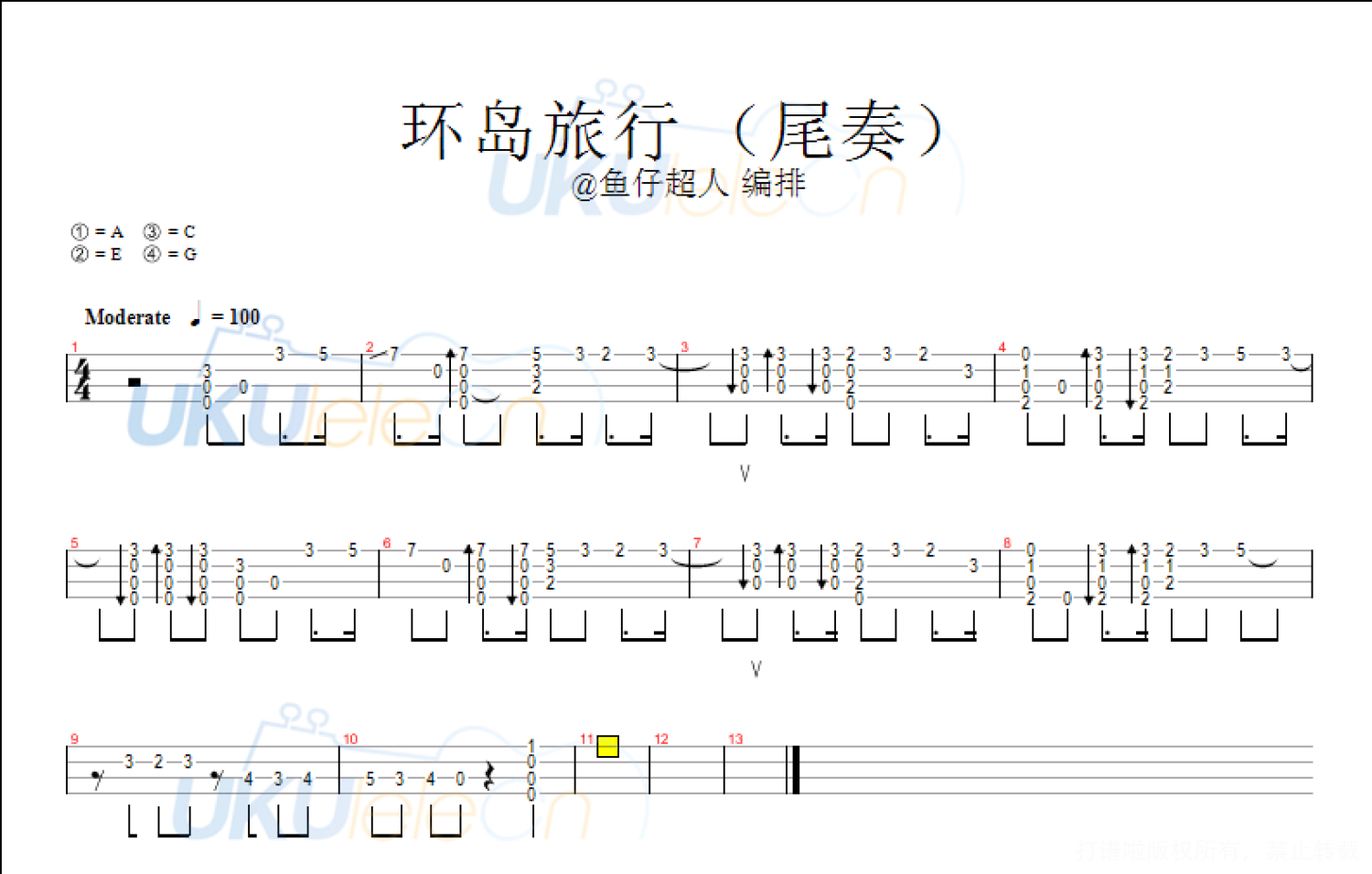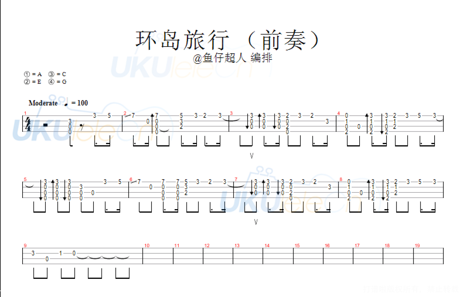 曲谱介绍: 歌曲的编排还是一致秉承了每月任务的特点,小段的指弹前奏,加上十分好用的弹唱节奏型,比较不一样的是这次加入了一小段比较俏皮的小段子作为歌曲的结尾,这一小段结尾选自小林的爵士小曲《Allofme》,大家可以感受一下这样会不会更好玩好听一些,以后也可以自己尝试把不同曲子相同风格的地方进行组合,也是一种蛮cool的玩法。环岛旅行尤克里里弹唱示范练习需要注意的地方:(1)曲子是C调的,对于男生来说偏高,女生可能会有点低。