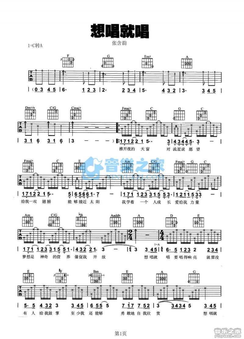 曲谱介绍: 想唱就唱《想唱就唱_》吉他弹唱谱,采用A调指法编配,共有2张高清图谱,免翻页排版设计。