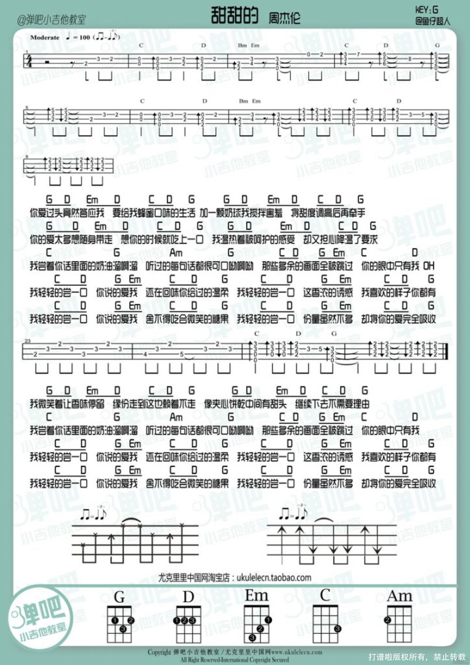 曲谱介绍: 周杰伦《甜甜的》_G调尤克里里谱