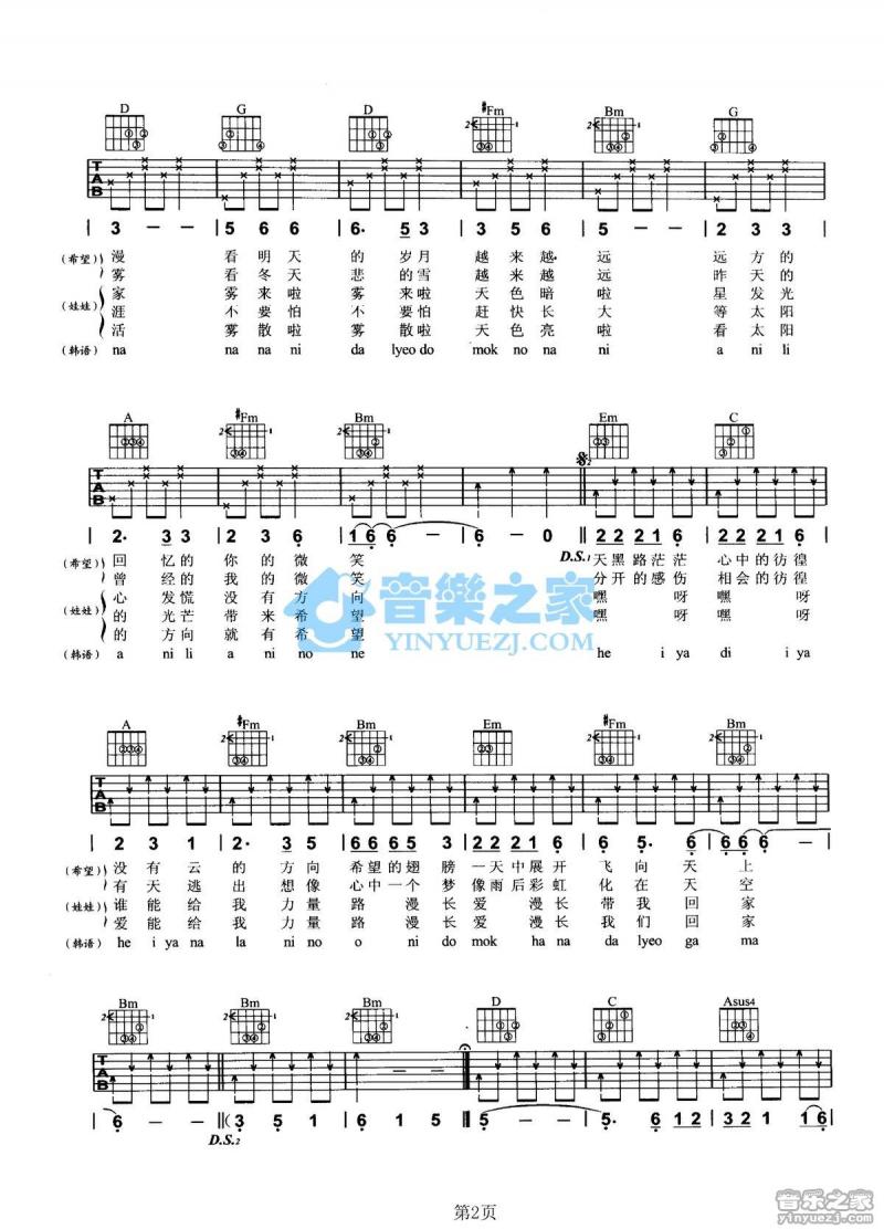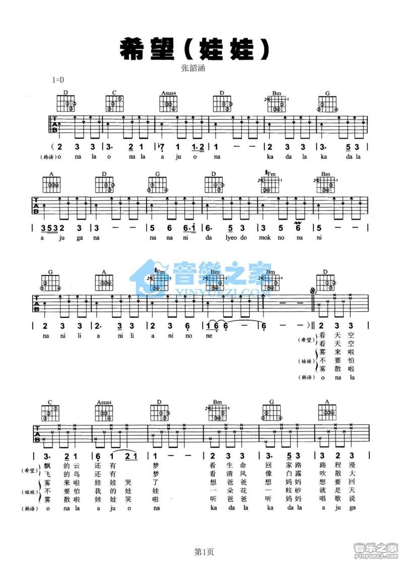 曲谱介绍: 希望《希望_》吉他弹唱谱,采用D调指法编配,共有3张高清图谱。