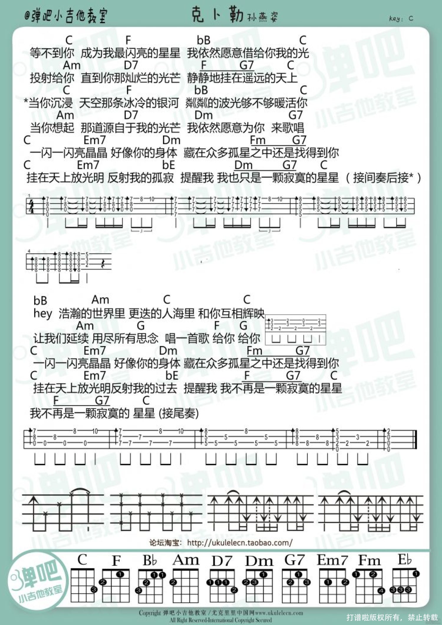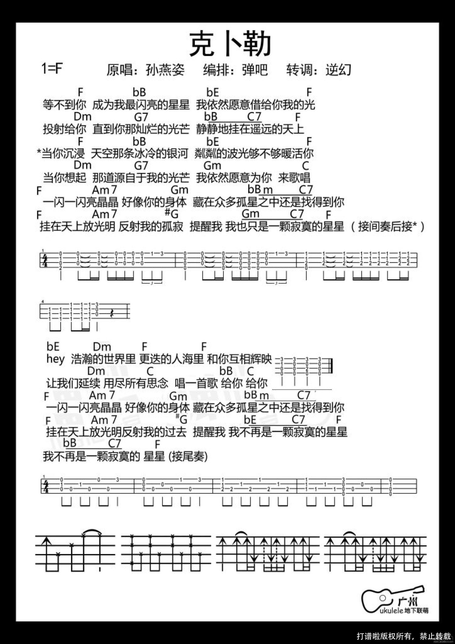 曲谱介绍: 分为两个部分:(1)歌曲的节奏型讲解(2)歌曲的间奏与尾奏讲解练习需要注意的地方:间奏部分有三连音的出现,在一拍里面三个音的音值是均等的,大家要注意不要弹成[前八后十六]喔。  补充:视频里有一个地方忘记讲了,就是第二段副歌以及最后一段的副歌部分和弦标注下划线的地方右手的节奏型没有在视频里面详细讲解。现在在这里补充~抱歉噢如下图所示,两个节奏型都是在前两拍【下下~上】的【上】的时候就要换标注了下划线的第二个和弦了~包括后面【我不再是一颗寂寞的星星】这一句的【F→G7】也一样噢!「虽然克卜勒是天上的星星,看似遥远,但梦想会让人接近想要到达的地方,并且闪耀光芒。克卜勒尤克里里琴谱女生C调版男生F调版