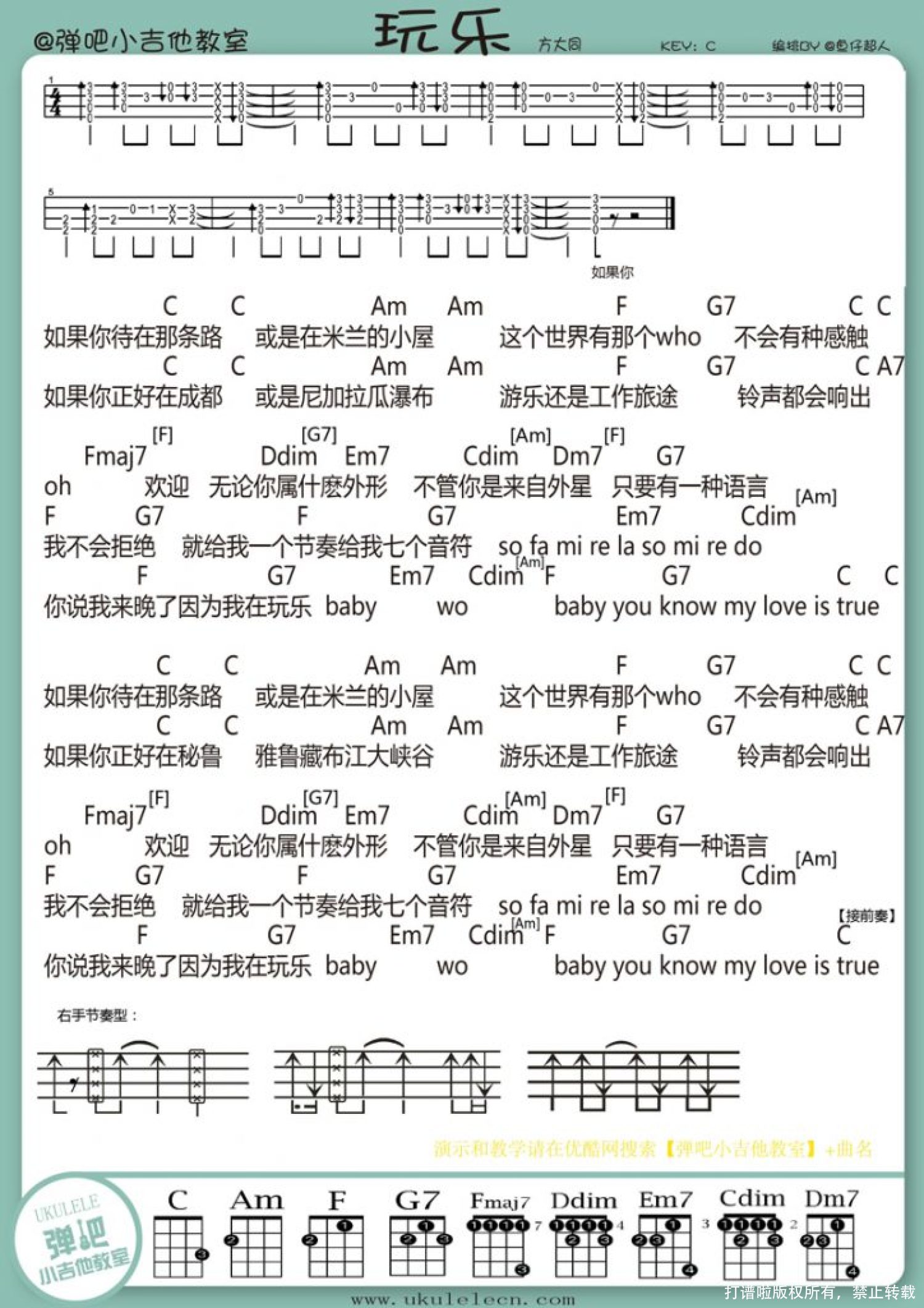 曲谱介绍: 方大同《玩乐》_C调尤克里里谱