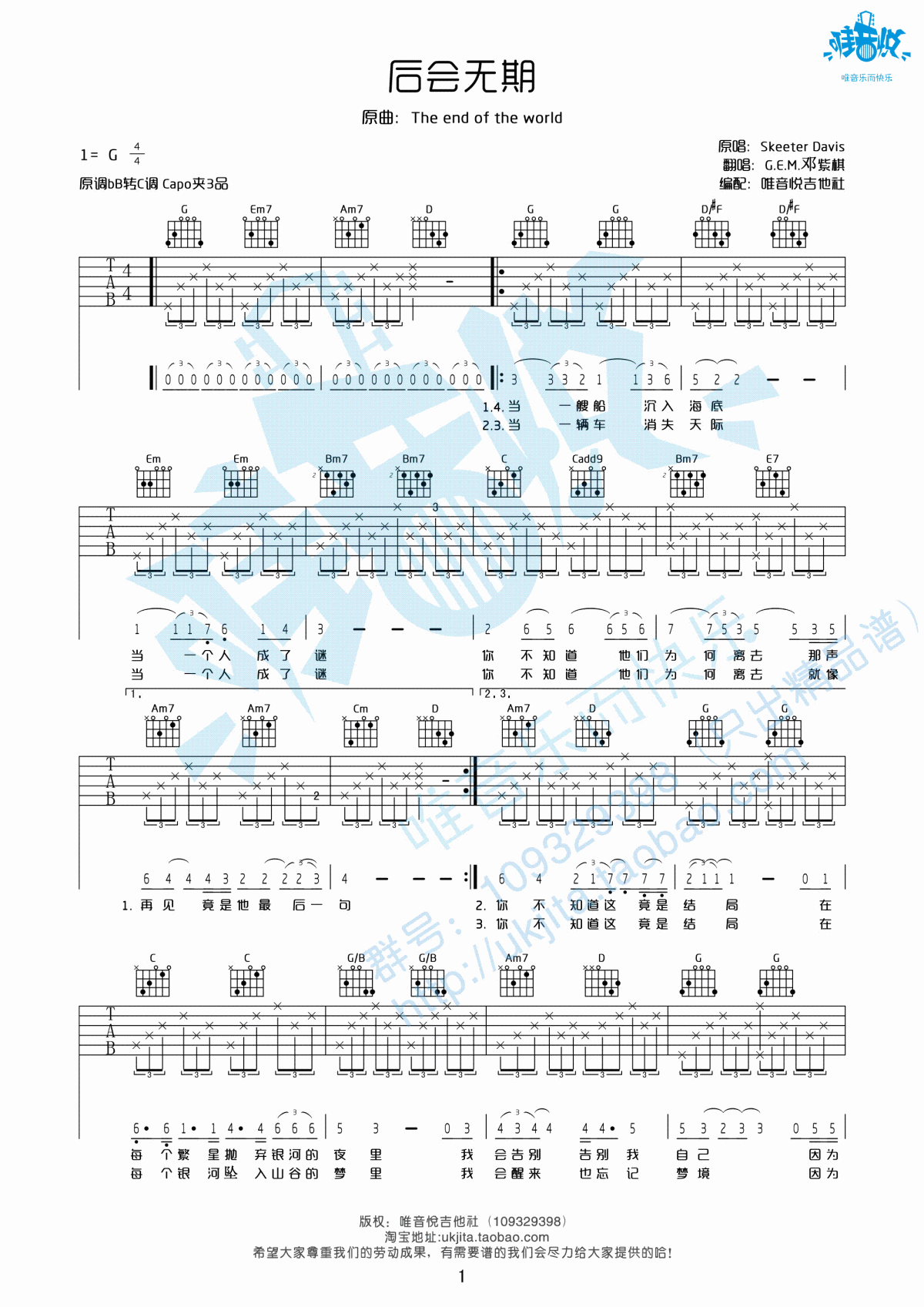 邓紫棋 后会无期吉他谱 - 邓紫棋 - G调吉他弹唱谱