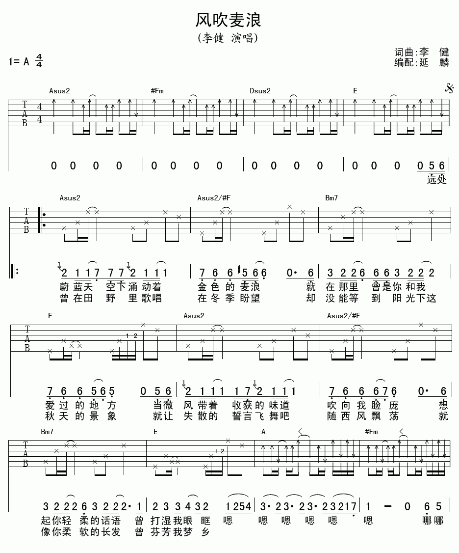 风吹麦浪吉他谱 - 李健 - A调吉他弹唱谱