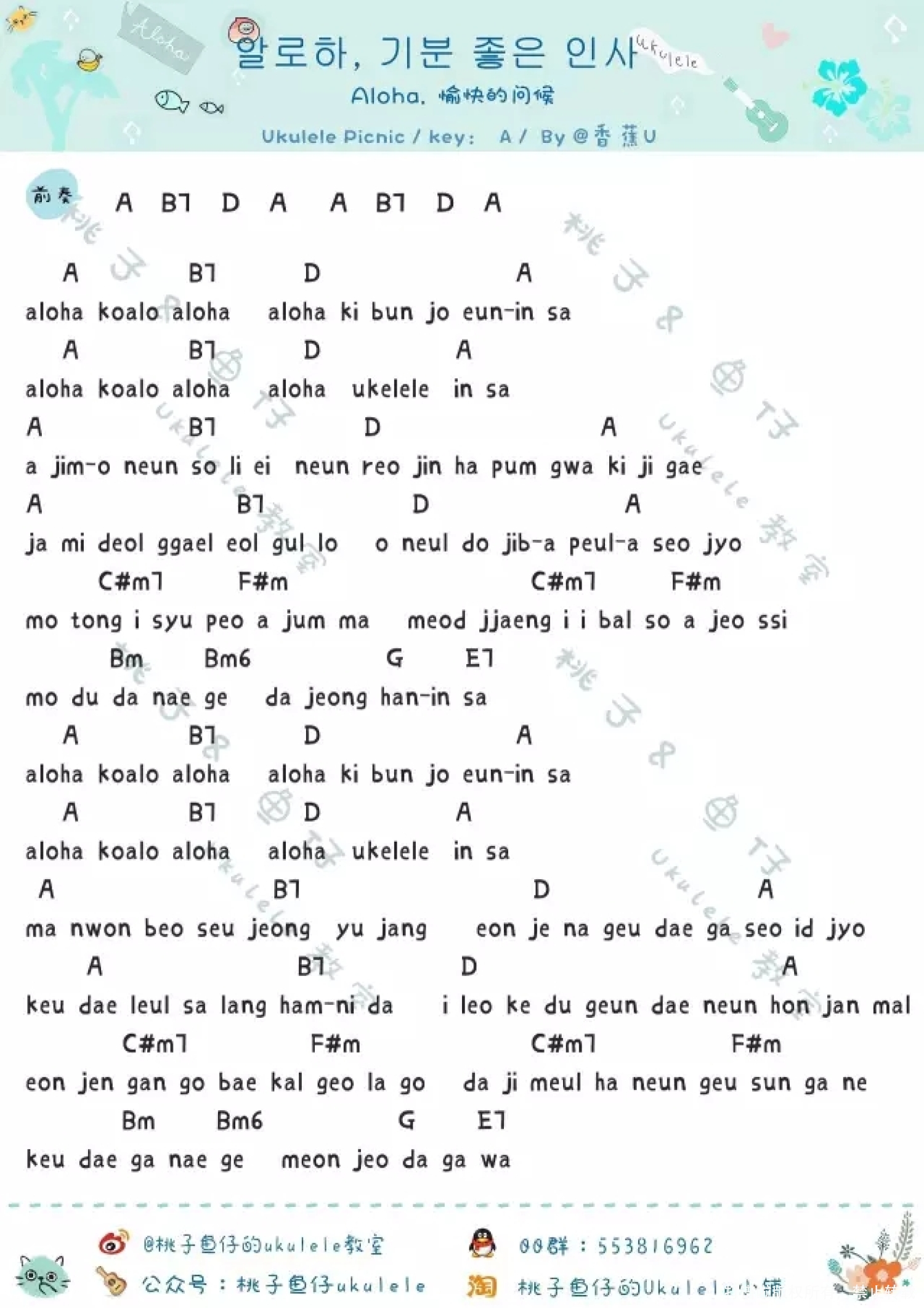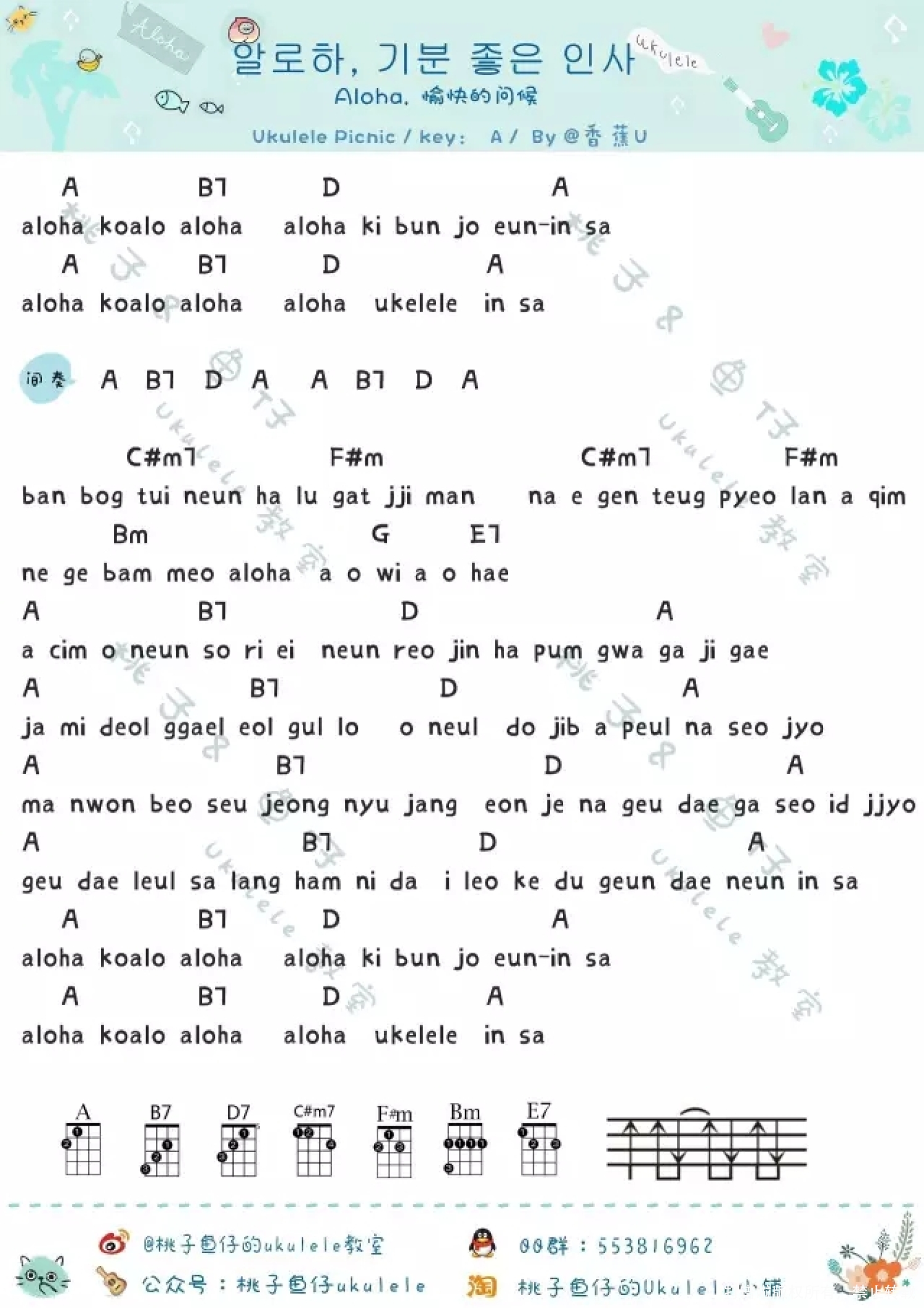 曲谱介绍: Ukulele Picnic《Aloha,愉快的问候》_A调尤克里里谱
