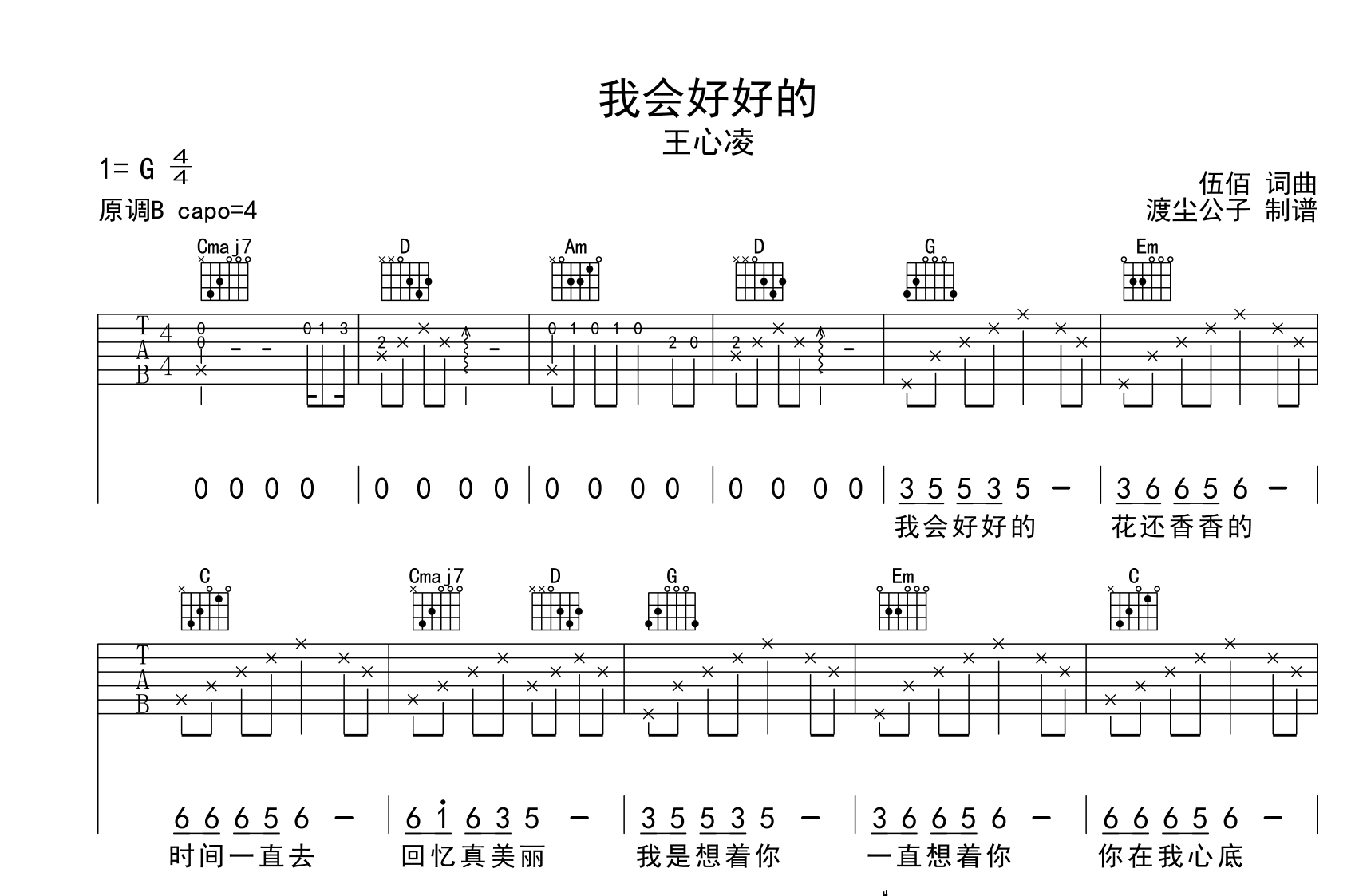 曲谱介绍: 我会好好的吉他谱,本吉他谱采用G调指法编配,来自@师渡尘编配制作,变调夹夹第4品演奏,原调B调,也可以根据个人嗓音条件灵活选择变调夹,演奏的速度控制在每分钟68拍左右,演奏难度一般。
