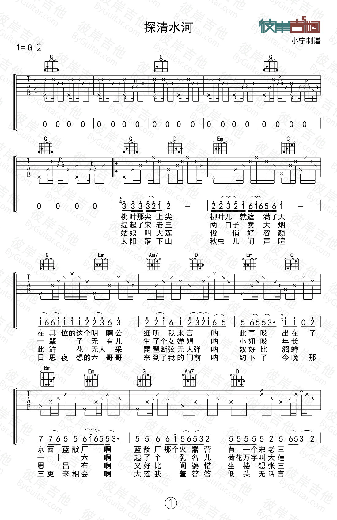 曲谱介绍: 探清水河吉他谱,德云社相声演员张云雷演唱,一首京韵京味的小调,探清水河六线谱,G调指法弹唱谱,小宁制谱。一首让人回味无穷的的曲子,温柔清透的歌声,慢悠悠地讲述着“大莲”和“六哥哥”的故事,唱出了浪漫而悲伤的爱情故事,让很多年轻人回到了那种从未享受过的慢节奏的生活里,别有一番味道。