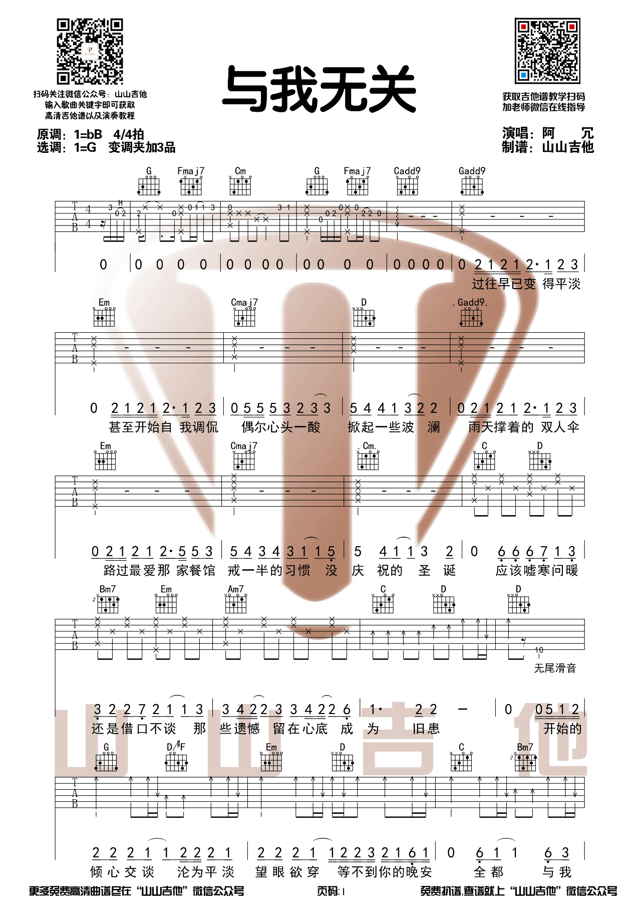 与我无关吉他谱 - 山山吉他 - G调吉他弹唱谱