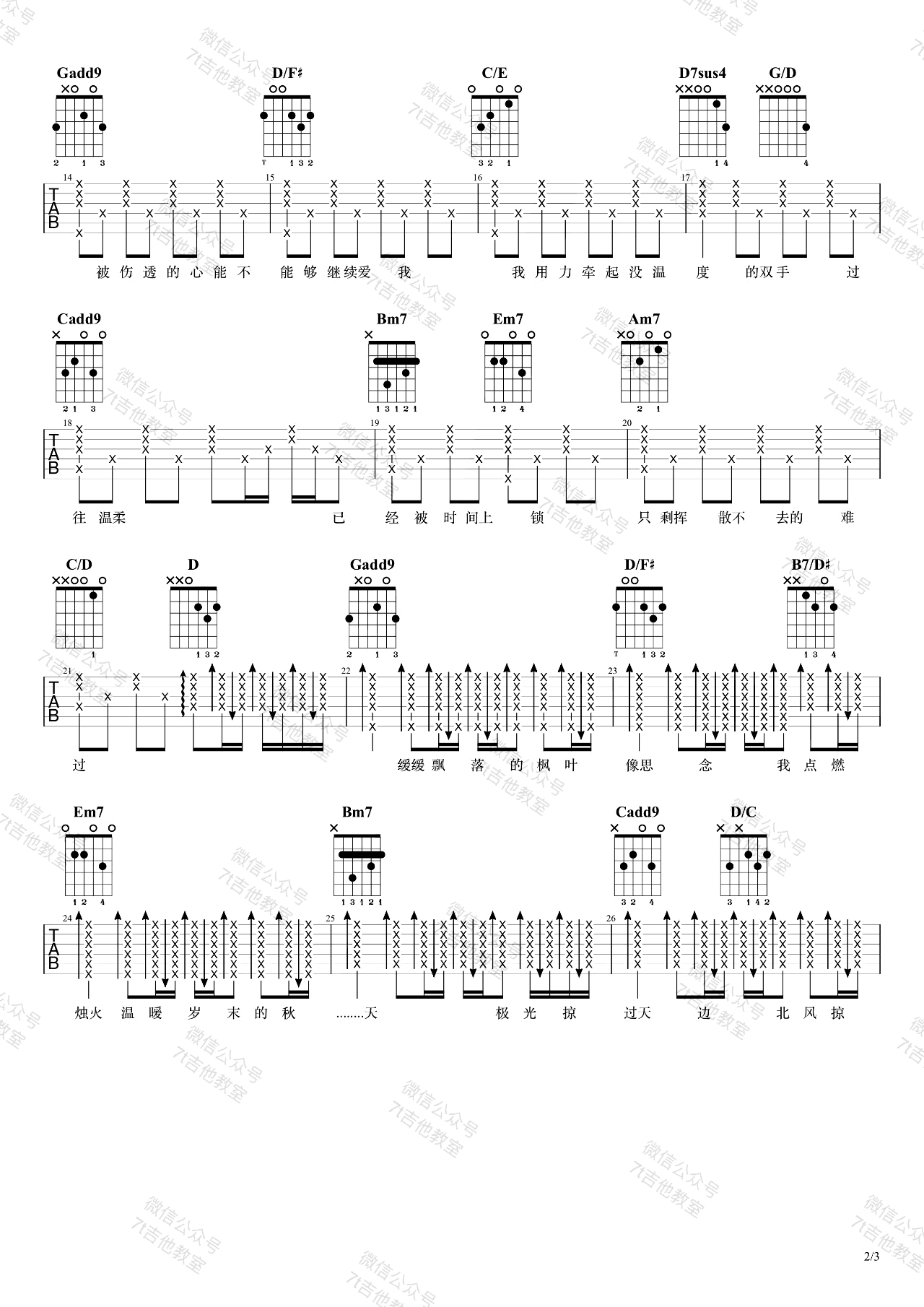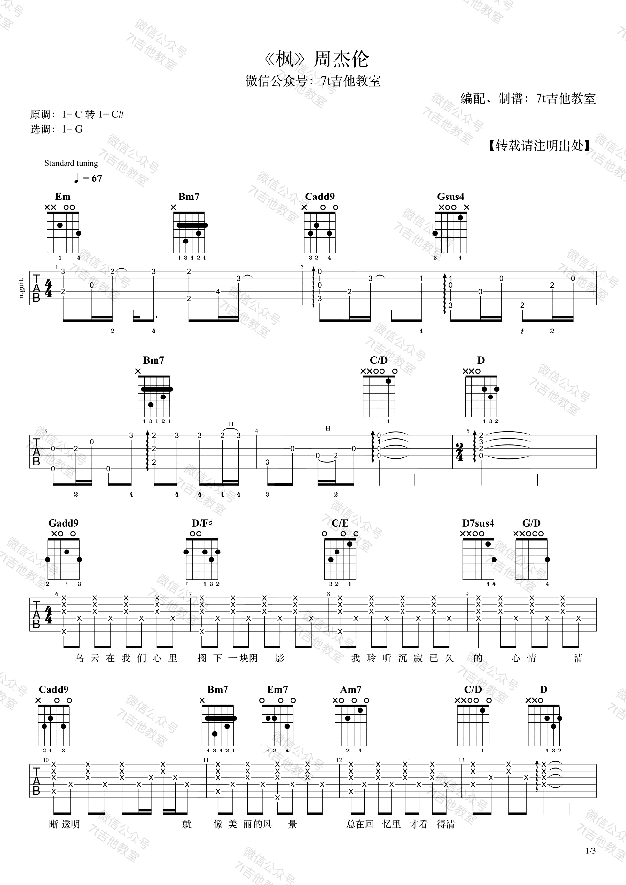 曲谱介绍: 枫吉他谱,周杰伦演唱的一首经典老歌,枫六线谱,三张图片谱,原调是C大调转C#大调,曲谱用的是G大调的指法来编配,吉他弹唱演示视频用了降半音调弦,没有使用变调夹,适合音域较低的男生~想唱原调的琴友们需要标准音调弦,变调夹5品, 感谢7T吉他教室编配制谱。 吉他弹唱演示及视频教学