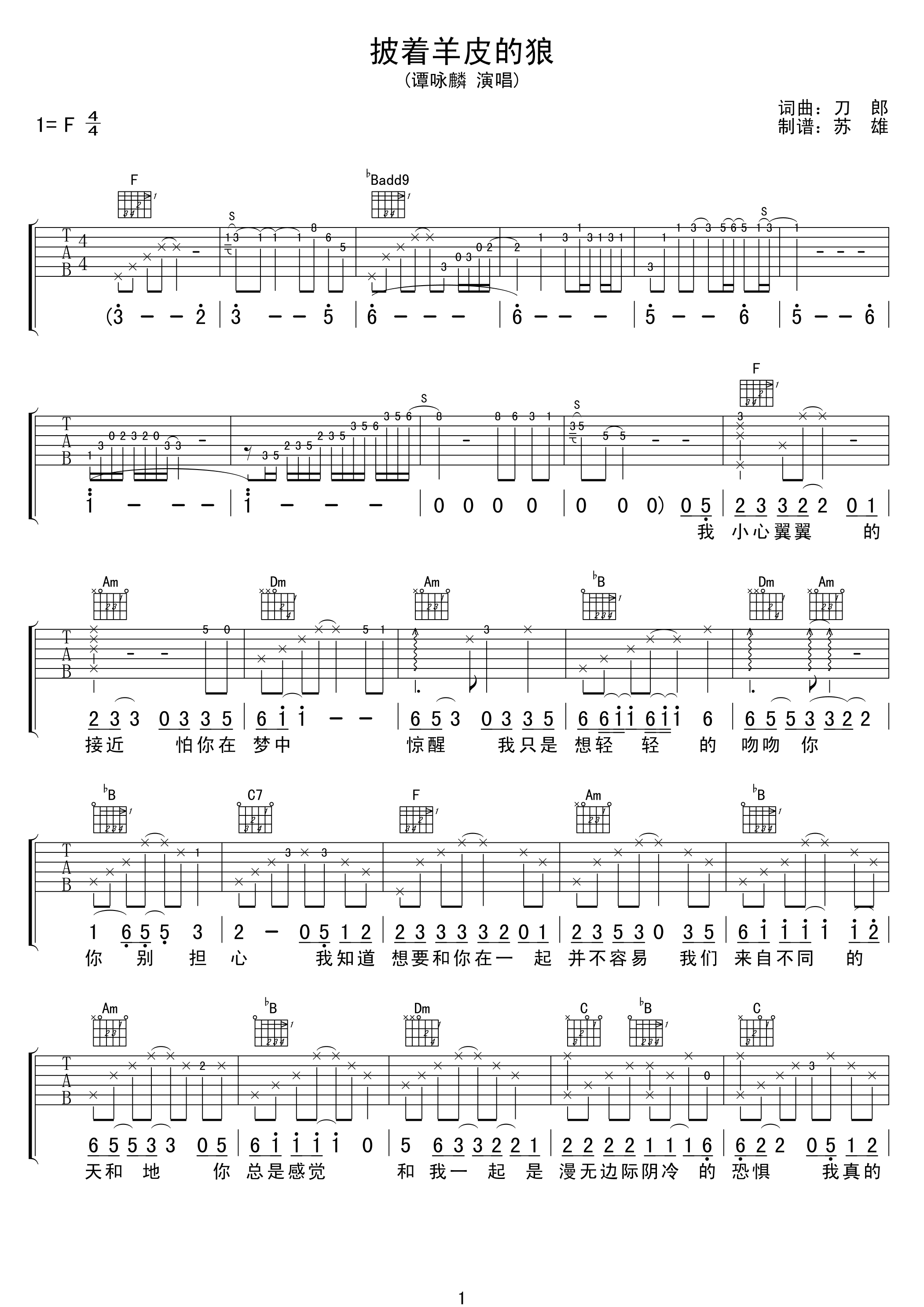 曲谱介绍: 披着羊皮的狼吉他谱采用了F调指法,由苏雄编配完成。《披着羊皮的狼》这首歌曲是刀郎作词作曲,谭咏麟演唱的一首歌曲,收录在谭咏麟发行的专辑《天地》中。这首歌是刀郎全力打造的一首歌曲,2006年的时候刀郎自己又对这首歌进行了重新演绎。这首歌曲的创作灵感来自于作者自己的生活环境和对感情的态度,用直白的歌词和深沉的情感述说着自己的心声和执着,同时,在这首歌曲之中,也展示了大西北人民特有的粗犷豪迈的性格。号外:在这里小编要推荐这首十指紧扣吉他谱,它也很好听,大家赶快学习起来啦,不要犹豫!