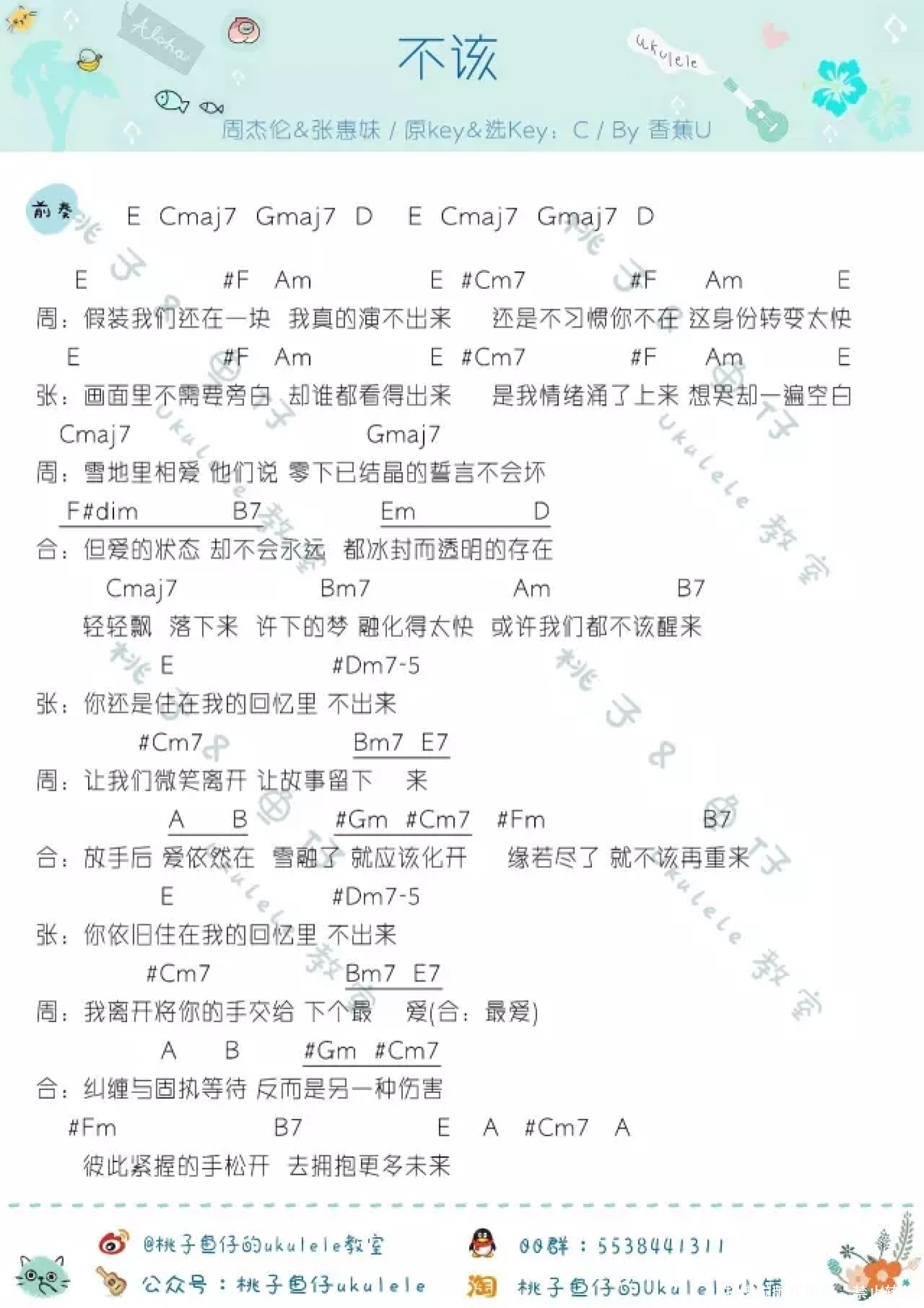 曲谱介绍: 周杰伦《不该》_C调尤克里里谱