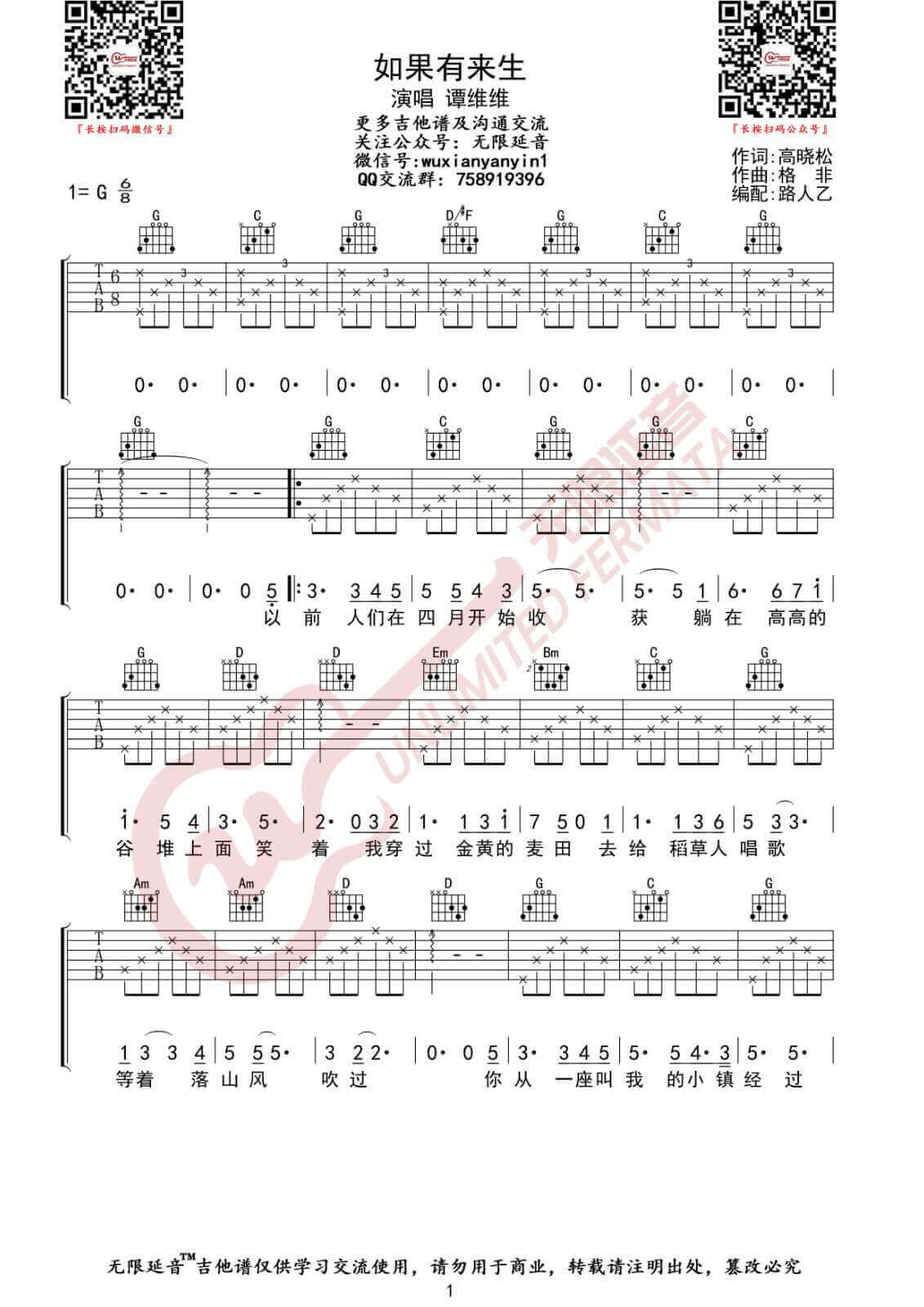 如果有来生吉他谱 - 谭维维 - G调吉他弹唱谱