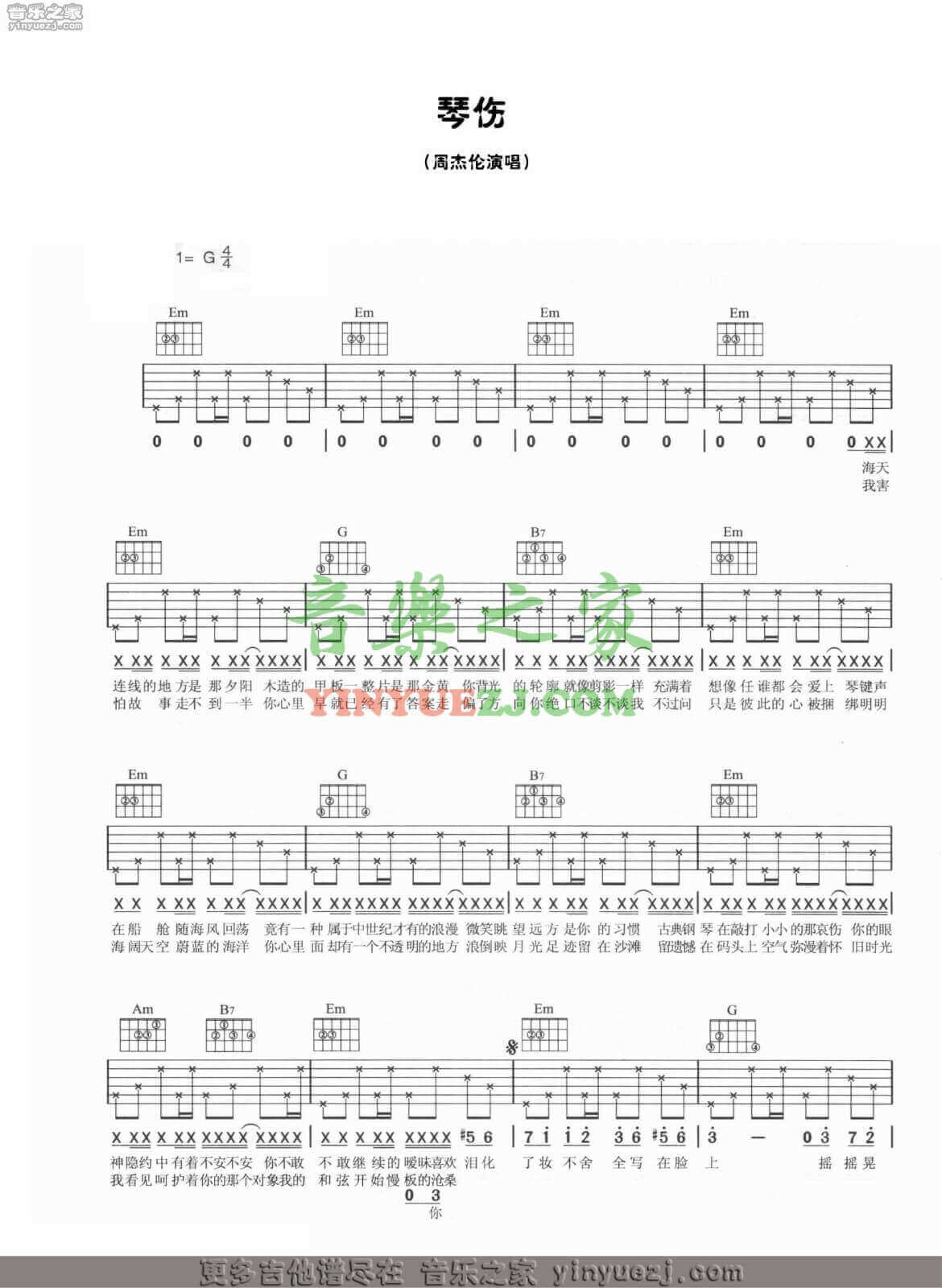 琴伤吉他谱 - 周杰伦 - G调吉他弹唱谱