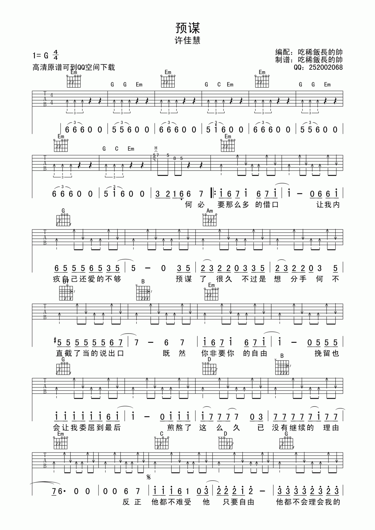 预谋吉他谱 - 许佳慧 - G调吉他弹唱谱