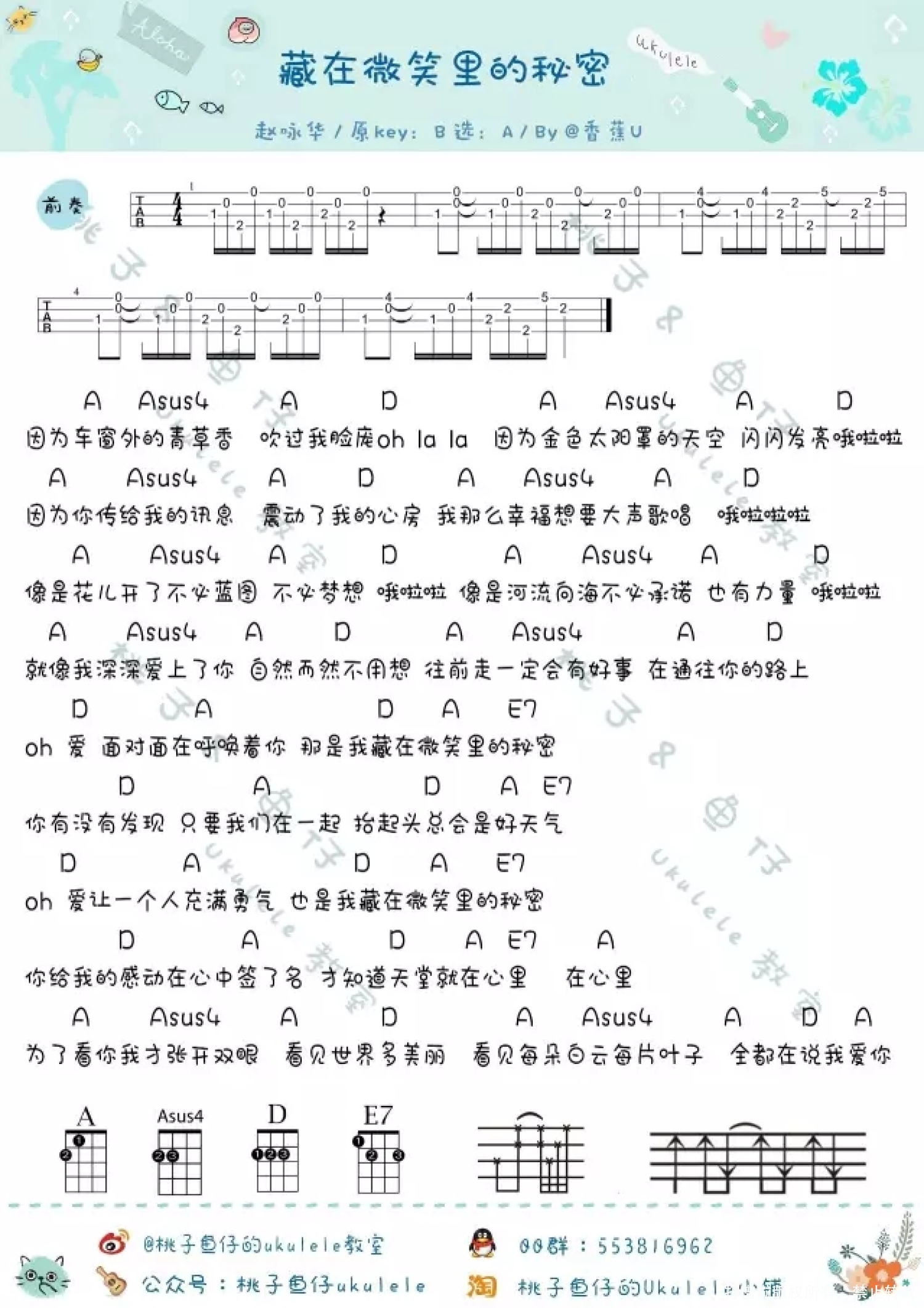曲谱介绍: 恶作剧之吻插曲《藏在微笑里的秘密》_A调尤克里里谱