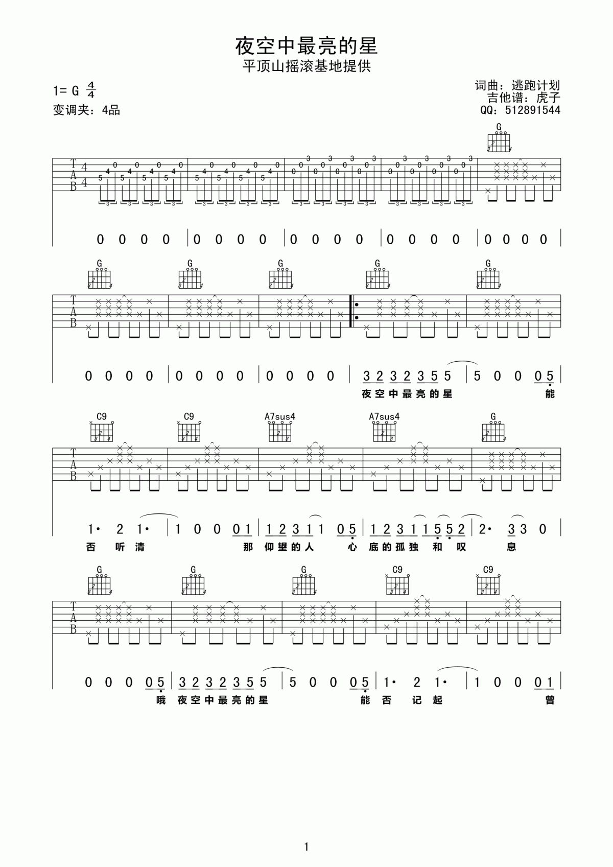 逃跑计划 夜空中最亮的星吉他谱 - 逃跑计划 - G调吉他弹唱谱