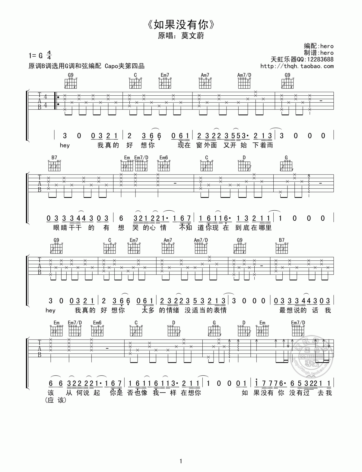 曲谱介绍: 莫文蔚《如果没有你》吉他谱,如果没有你六线谱,C调简单版,变调夹男生3-5品,女生不用夹。最朴素的语言,唱出最感人的情感。