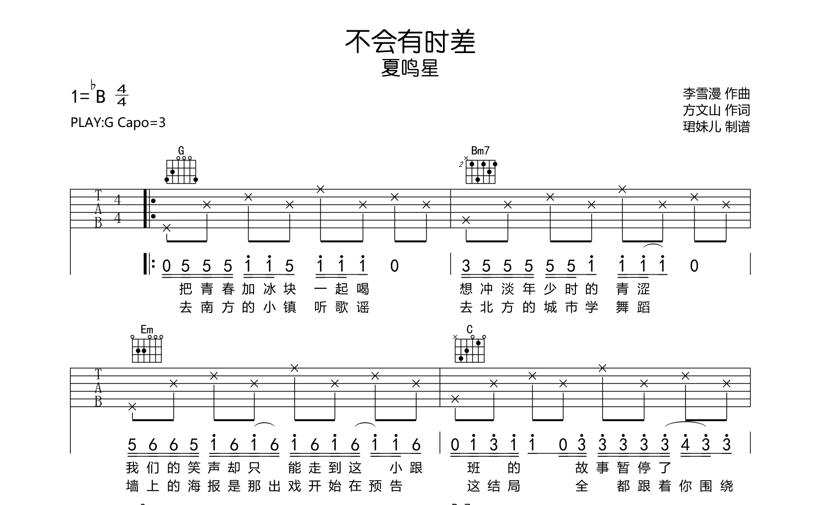 不会有时差吉他谱 - 夏鸣星 - G调吉他弹唱谱