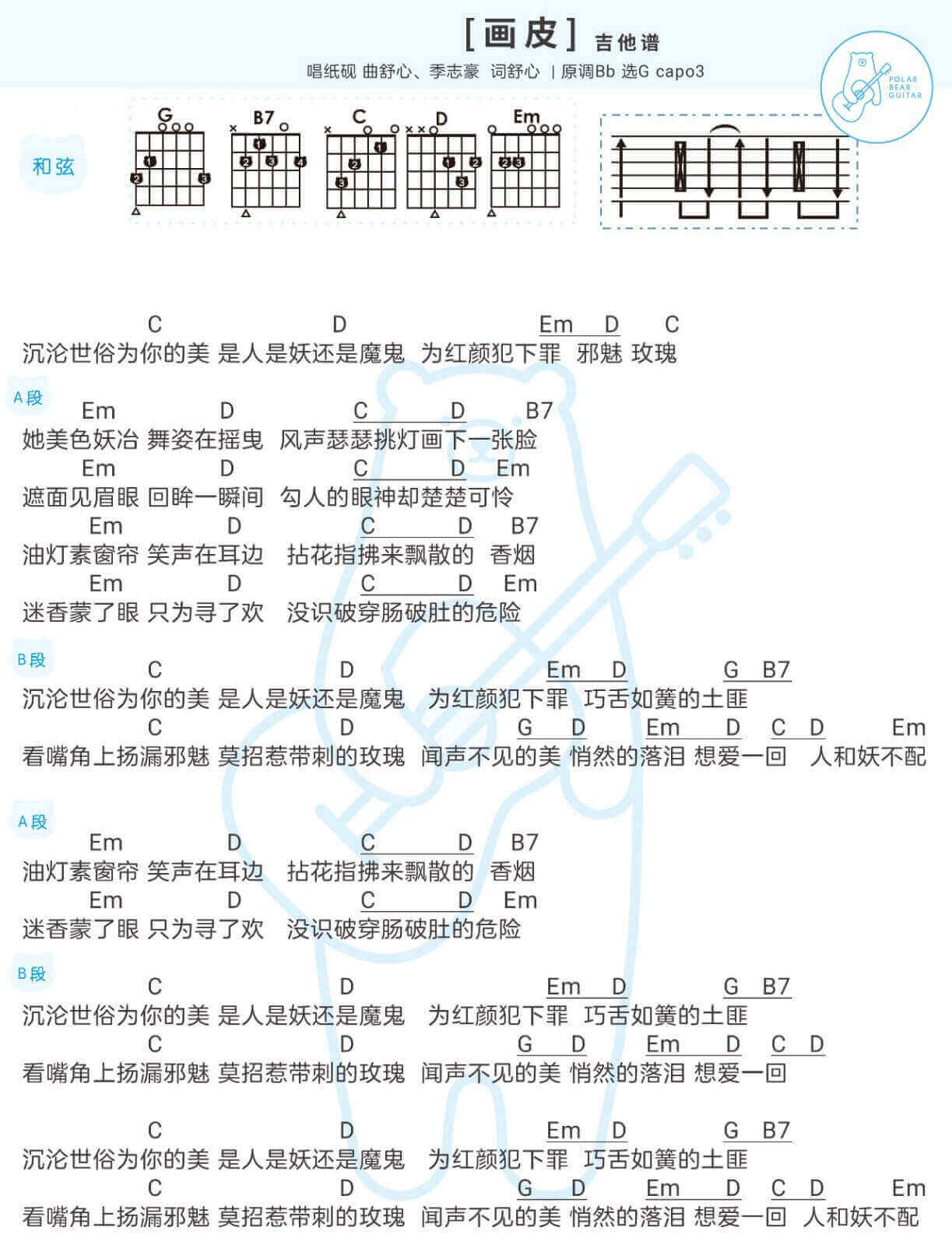 曲谱介绍: 画皮吉他谱_纸砚_《画皮》G调弹唱谱_高清图片谱分享,《画皮》是由纸砚zyan演唱的一首歌曲,有一种有现代感气息的画皮,"她美色妖冶,舞姿在摇曳,风声瑟瑟挑灯画下一张脸,遮面见眉眼,回眸一瞬间,勾人的眼神却楚楚可怜",歌词仿佛见证了一段人妖之恋,国风和电音结合,轻快富有古风韵味的旋律朗朗上口,越听越好听。
