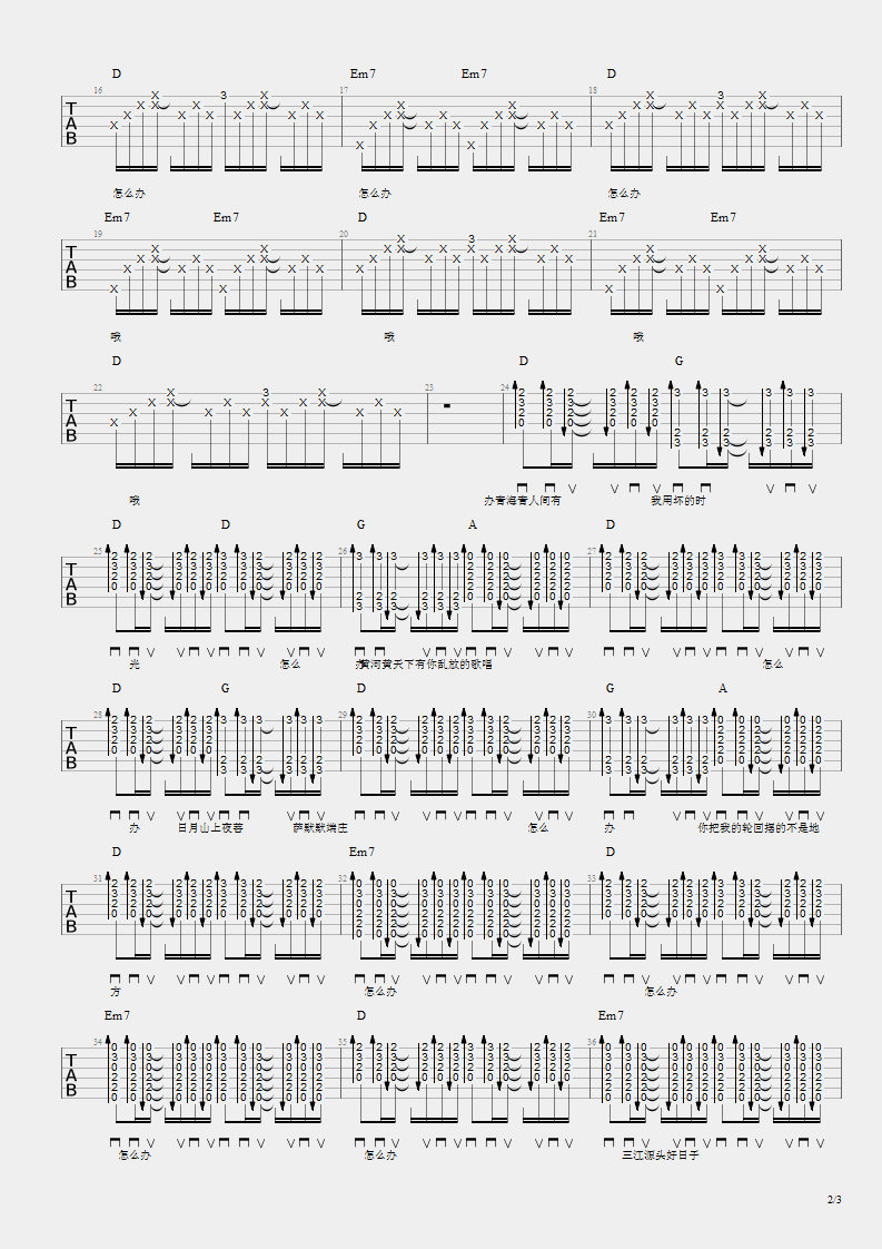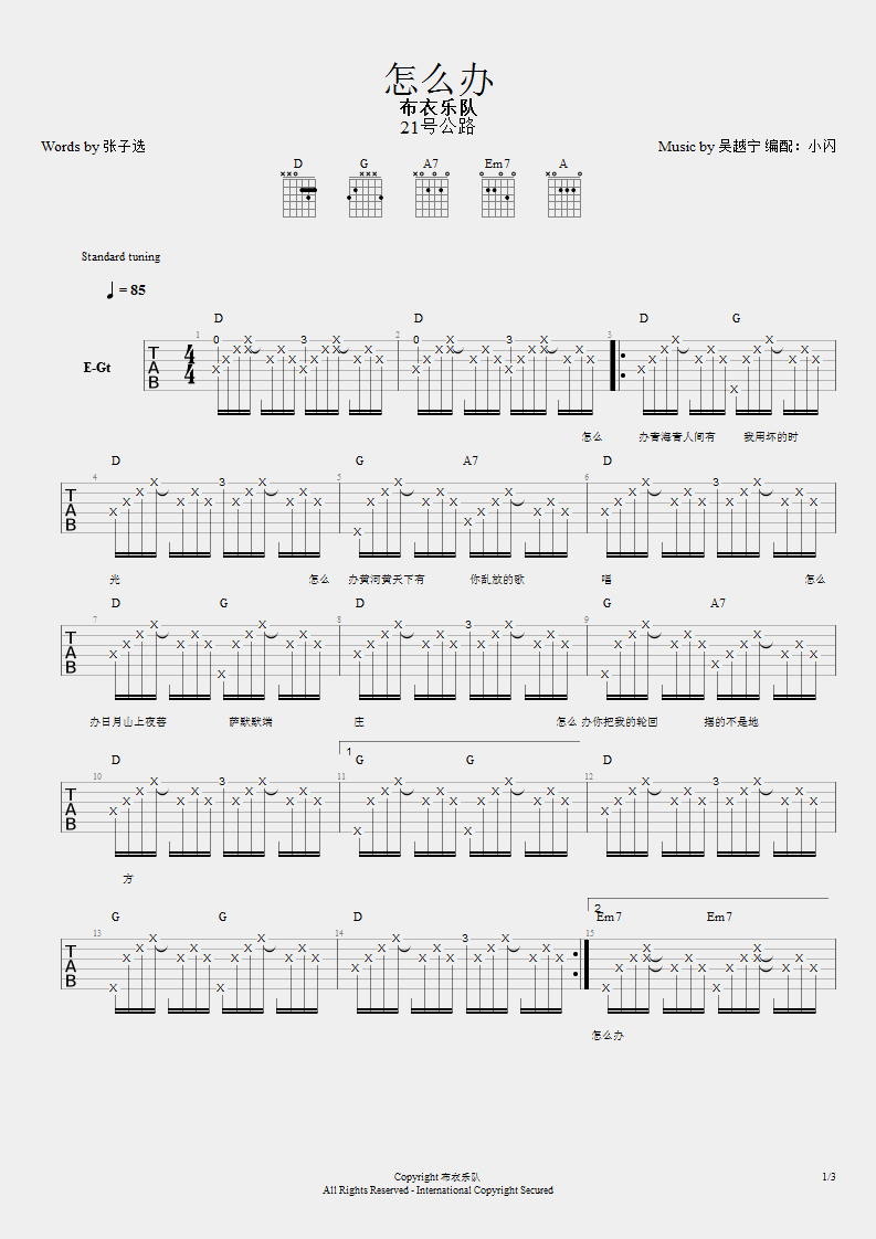 曲谱介绍: 怎么办吉他谱_布衣乐队_《怎么办》D调弹唱谱_高清六线谱分享,《怎么办》是由布衣乐队演唱的一首歌曲,这首歌歌词“用坏的时光”、“乱放的歌唱”、“你把我的轮回摆的不是地方”、“三江源头好日子白白流淌”,这已经不再是歌词,而是诗歌了,加上优美的旋律被鼓和吉他完美呈现,诗歌、音乐、歌唱三位一体的讲述了一个情绪,一种心境、一个状态,一种心情,一种思念,一种倾诉。