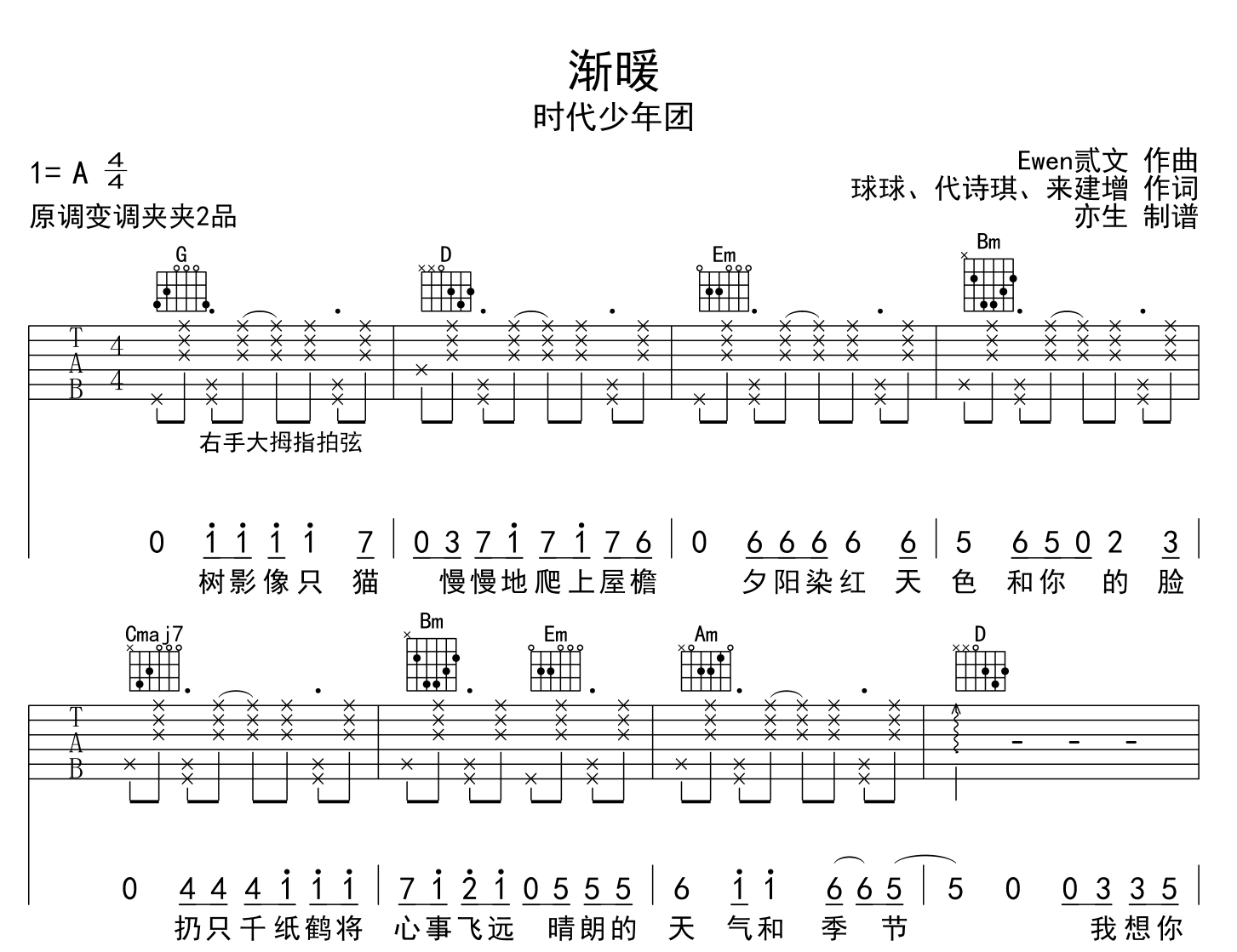 曲谱介绍: 渐暖吉他谱_时代少年团_《渐暖》G调吉他弹唱谱分享,青春阳光的旋律仿佛吹响着寒冬的渐逝,春意的渐暖,歌曲中没有复杂的词语,所有的仿佛在投射我们曾经记忆中最纯粹的青春,如果在这个冷冽的冬季之中,还有什么不愉快的心事,不放让这首歌曲让你的心情渐渐暖起来。 渐暖吉他谱,时代少年团演唱,选用G调,《渐暖》吉他弹唱谱,节奏为4/4拍,速度为110拍每分钟,弹唱建议变调夹夹2品,难度较简单。