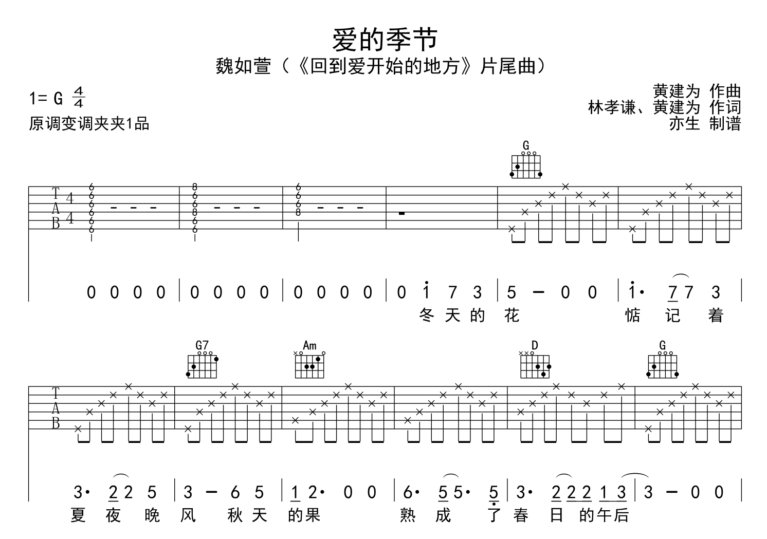 曲谱介绍: 魏如萱《爱的季节》是电影《回到爱开始的地方》片尾曲。 魏如萱《爱的季节》吉他谱,由亦生制谱,选用G调指法,《爱的季节》弹唱六线谱,节奏为4/4拍,速度为95拍每分钟,弹唱建议变调夹夹1品,难度较简单,主要以分解和弦为节奏型。