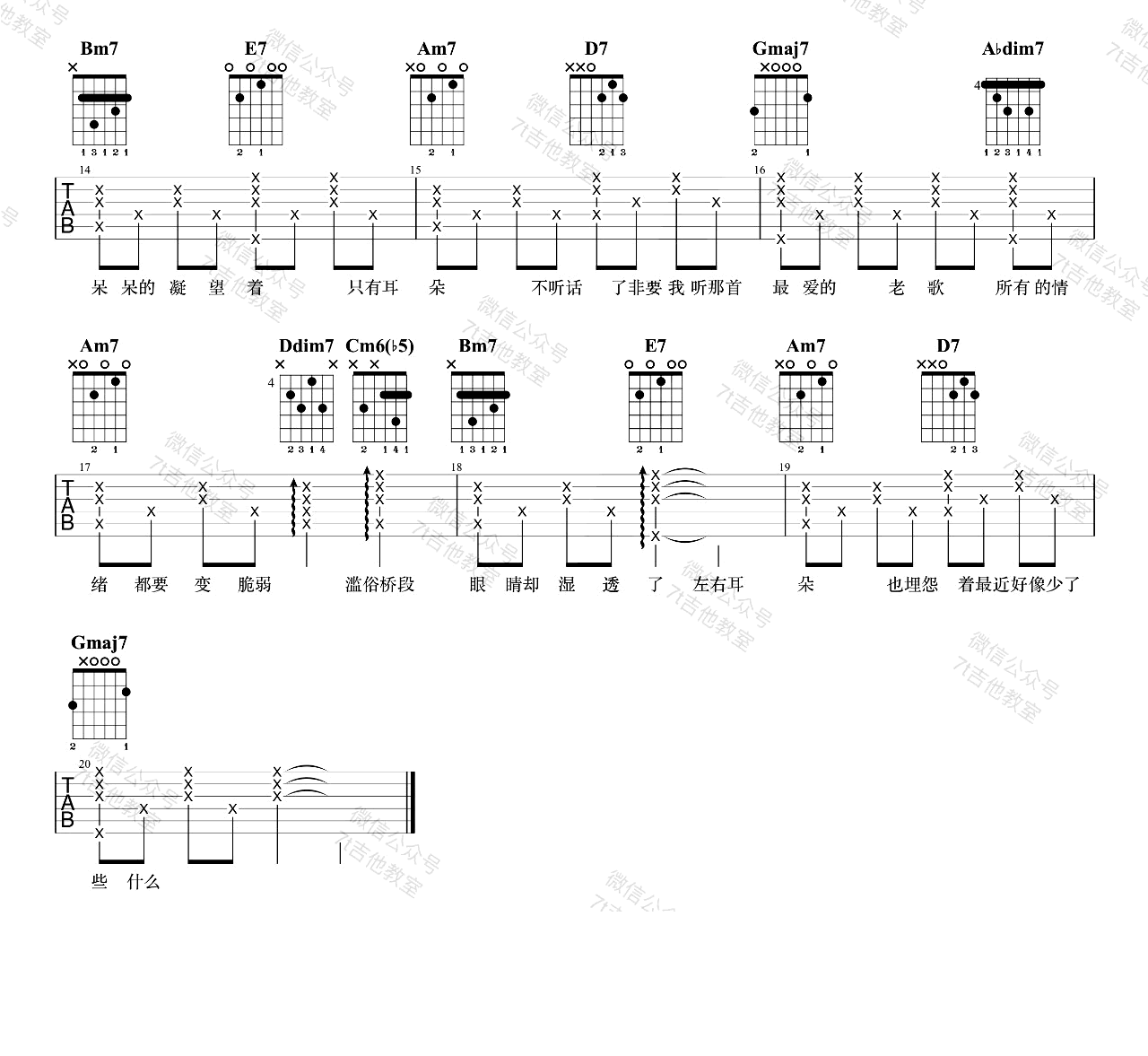 曲谱介绍: 耳朵吉他谱_李荣浩_《耳朵》G调原版六线谱_吉他弹唱教学分享,《耳朵》是由李荣浩编曲并演唱的一首歌。有时候,耳朵比眼睛还重要,一个人可以假装开心,但声音就装不了,仔细一听就知道了。这首歌仿佛就像在告诉世人,我会年少有为,请用耳朵认真听。 此版本的曲谱及教学来源于7T吉他教室出品,歌曲原调为#G调,这里采用了G调指法根据原版进行编配,演唱时夹变调夹1品回到原调。这首歌编配难度不算太大,节奏型比较简单,和弦相对来说复杂一些,不懂的参考视频。 耳朵吉他谱_李荣浩_《耳朵》G调原版六线谱_吉他弹唱教学视频: 吉他弹唱演示及视频教学 耳朵吉他谱_李荣浩_《耳朵》G调原版吉他弹唱六线谱_高清图片谱1: