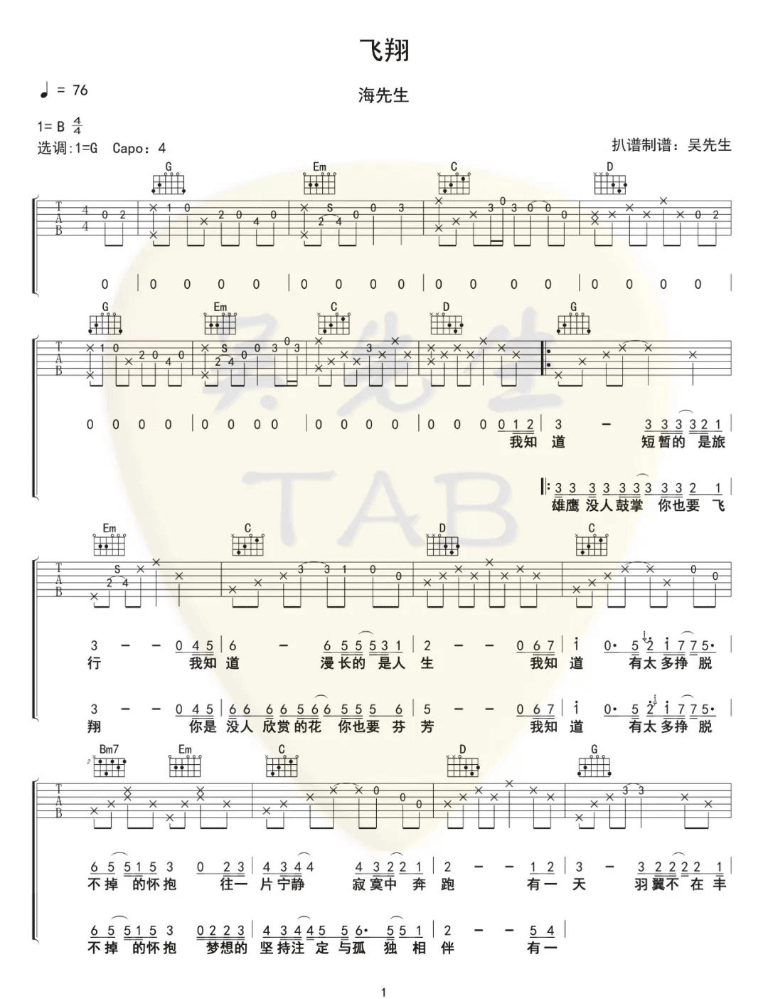 曲谱介绍: 飞翔吉他谱_海先生_《飞翔》G调原版弹唱六线谱_高清图片谱分享,《飞翔》是由海先生演唱的一首歌。 此版本的曲谱来源于吴先生扒谱制谱,歌曲原调为B调,这里采用了G调指法根据原版进行编配,演唱时夹变调夹4品回到原调。前奏部分的编配时一段好听的旋律,后面在分解和扫弦之中穿插一点旋律音,难度不是特别大。 飞翔吉他谱_海先生_《飞翔》G调原版弹唱六线谱_高清图片谱1-2: