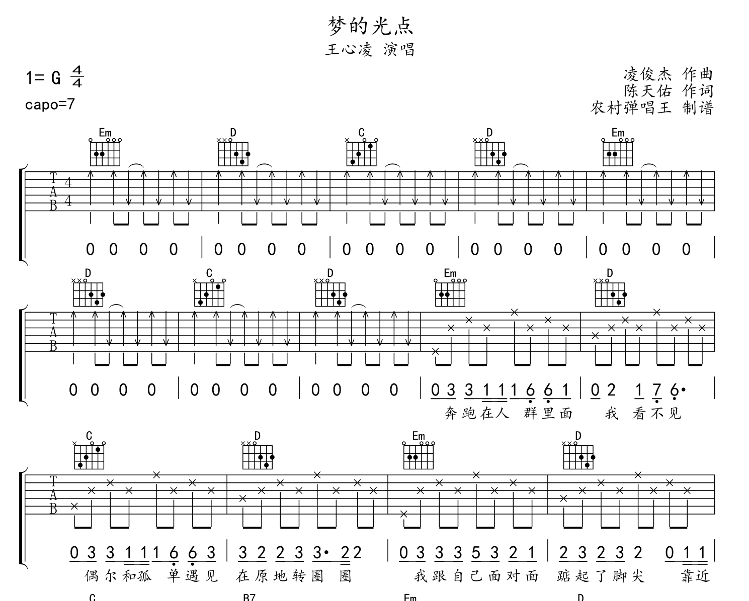 曲谱介绍: 王心凌《梦的光点》吉他谱_G调男女通用版吉他谱分享,《梦的光点》是王心凌演唱的一首经典老歌,最近又火了起来,欢快旋律之中,似乎显得那么的纯粹无暇,梦想永远点亮光芒,有梦的地方,总有光点照亮前方。 王心凌《梦的光点》吉他谱,农村弹唱王制谱,选用G调指法,《梦的光点》吉他弹唱谱,共两张高清图片谱例,节奏为4/4拍,速度为85拍每分钟,原调女生夹7品,男生建议夹5品,难度简单。