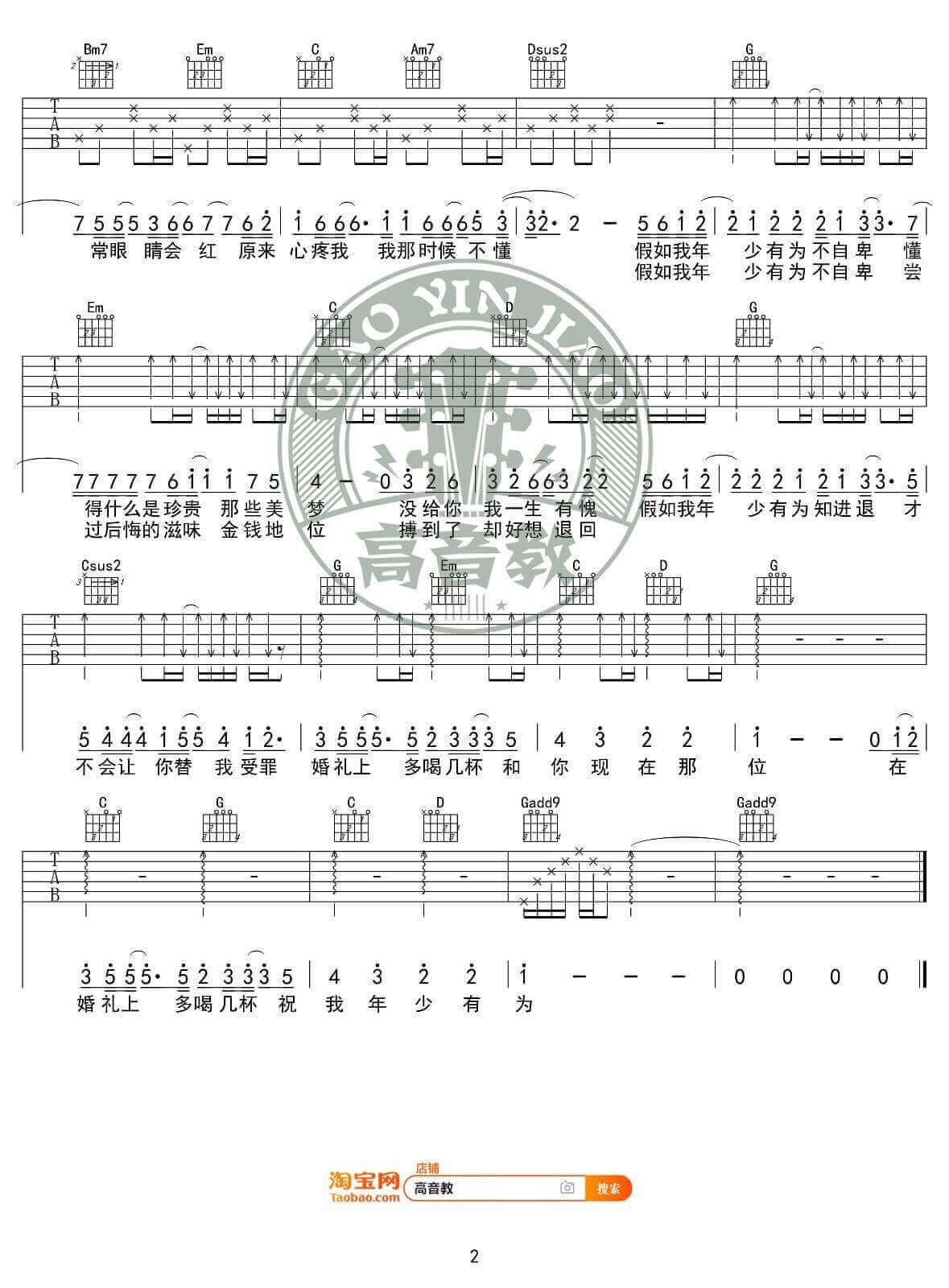 曲谱介绍: 李荣浩《年少有为》G调精华版吉他弹唱六线谱_高清图片谱分享,此前给大家带来过很多个李荣浩《年少有为》吉他谱的版本,此次为高音教团队编配的精华版,采用G调指法编配,根据自己的嗓音情况选择变调夹。一首经典的“浩式情歌”,诉说了一段平凡爱情里的刻骨铭心,歌词“假如我年少有为”包含了说不出口的抱歉和愧对于心。 李荣浩《年少有为》G调精华版吉他弹唱六线谱_高清图片谱1: