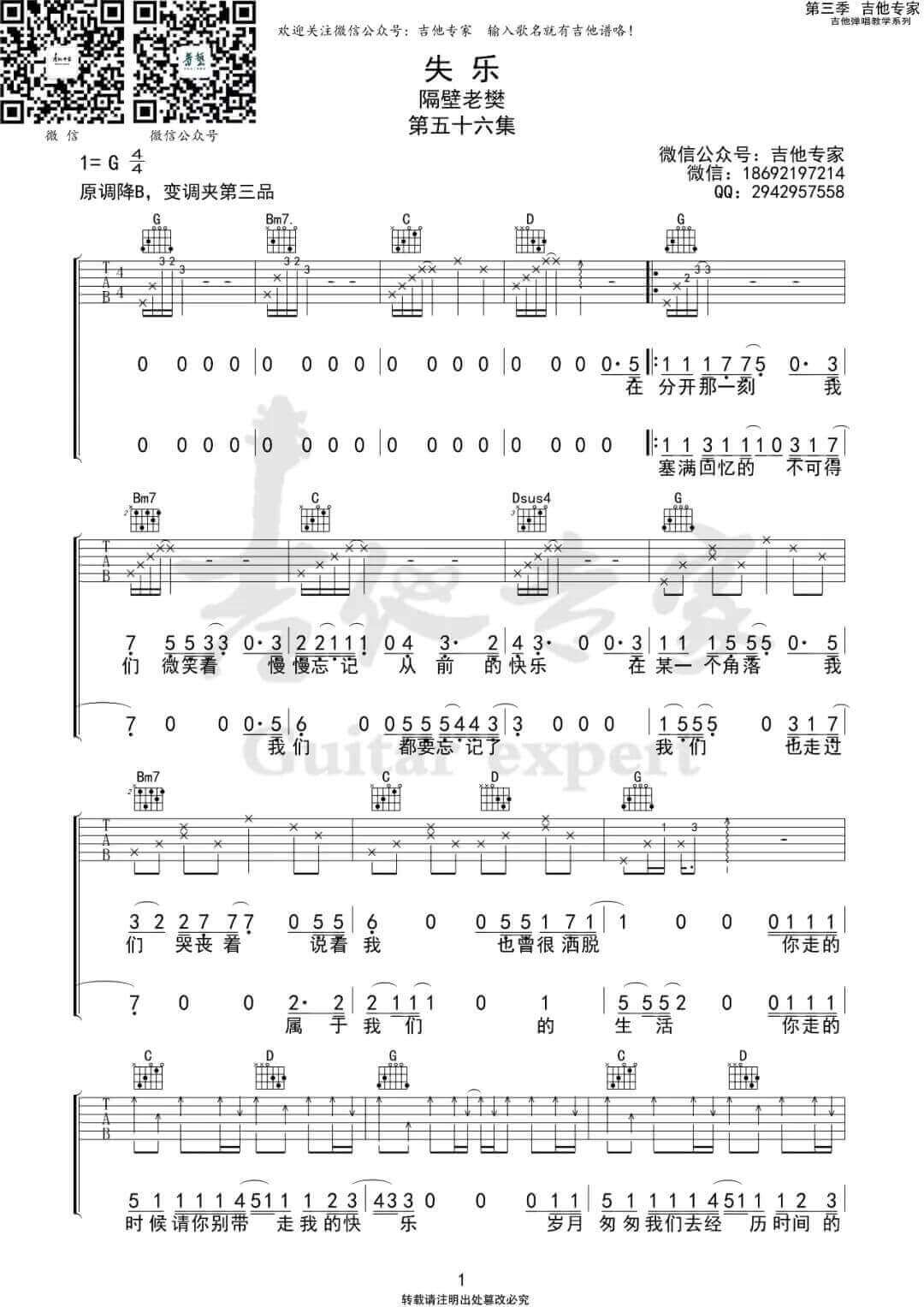 曲谱介绍: 失乐吉他谱_隔壁老樊_《失乐》G调原版弹唱谱_高清六线谱分享,《失乐》是由隔壁老樊作词、作曲并演唱的一首歌曲,这首歌是隔壁老樊民谣曲中意义深刻的。词涉及成长的崎岖,感情的无奈,毒舌男生独自承担世人眼神。曲中之痛无人懂,遭遇之难万人疼。歌曲原调为降B调,这里采用G调指法进行编配,演唱时夹变调夹3品可回原调。
