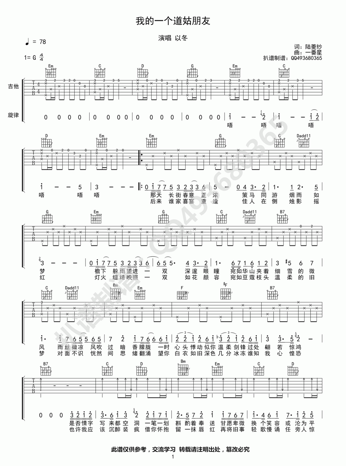 曲谱介绍: 以冬《我的一个道姑朋友》吉他弹唱谱,采用G调指法编配,共有3张高清图谱。