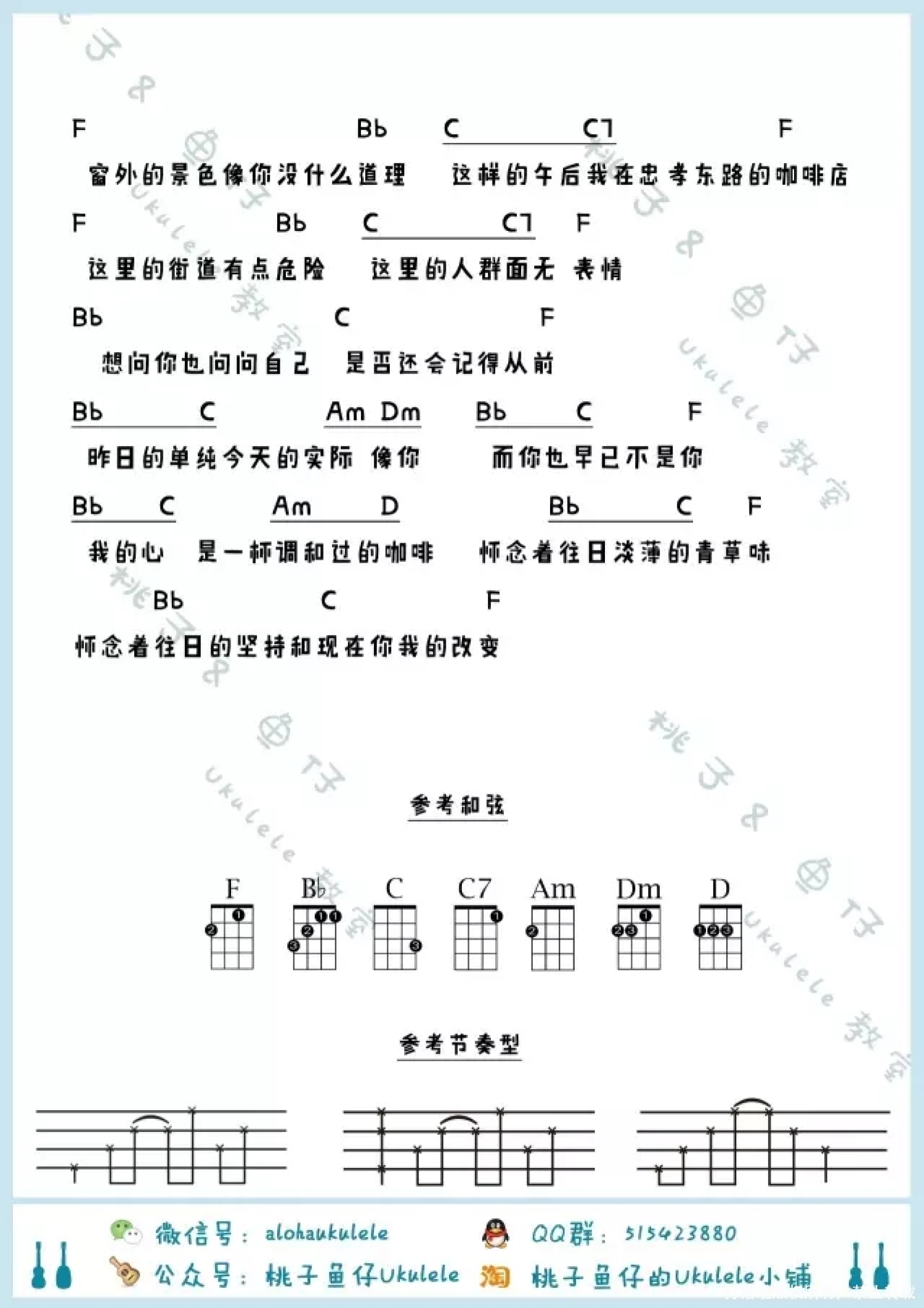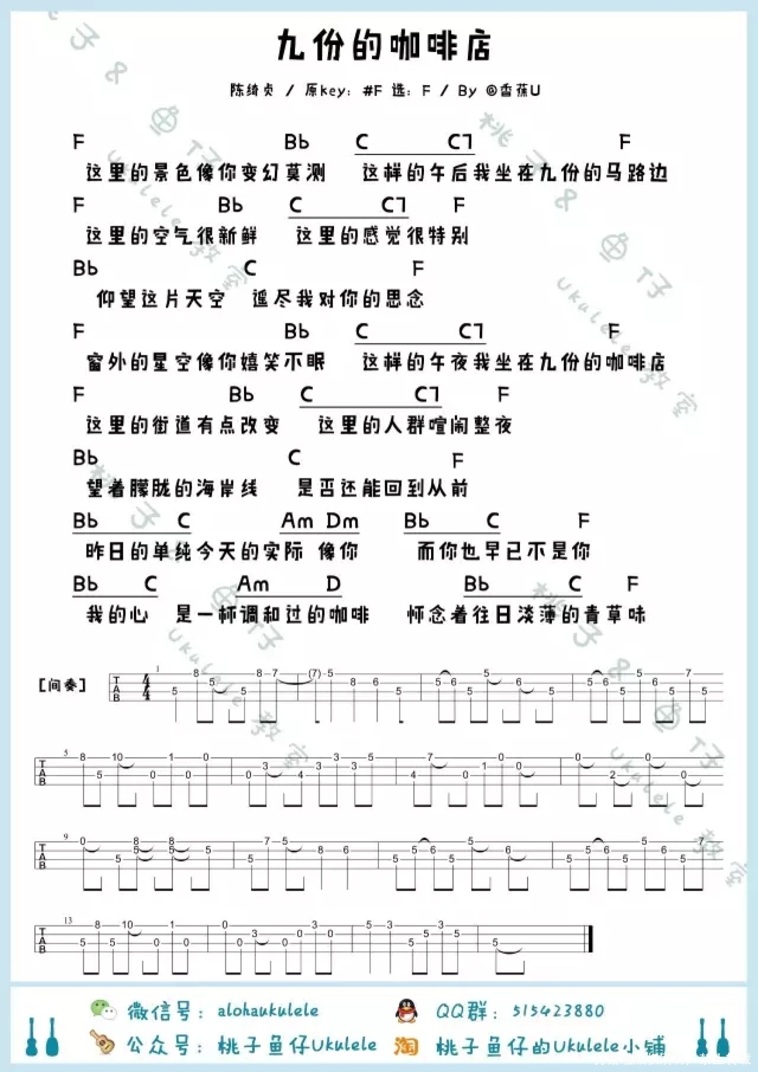 曲谱介绍: 陈绮贞《九份的咖啡店》_F调尤克里里谱