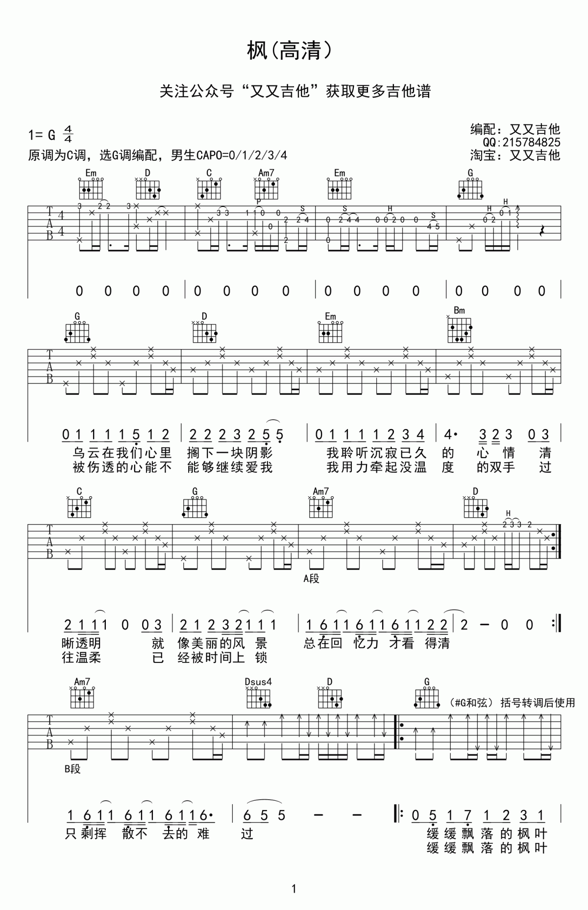 曲谱介绍: 周杰伦《枫》吉他弹唱谱,采用G调指法编配,共有3张高清图谱。