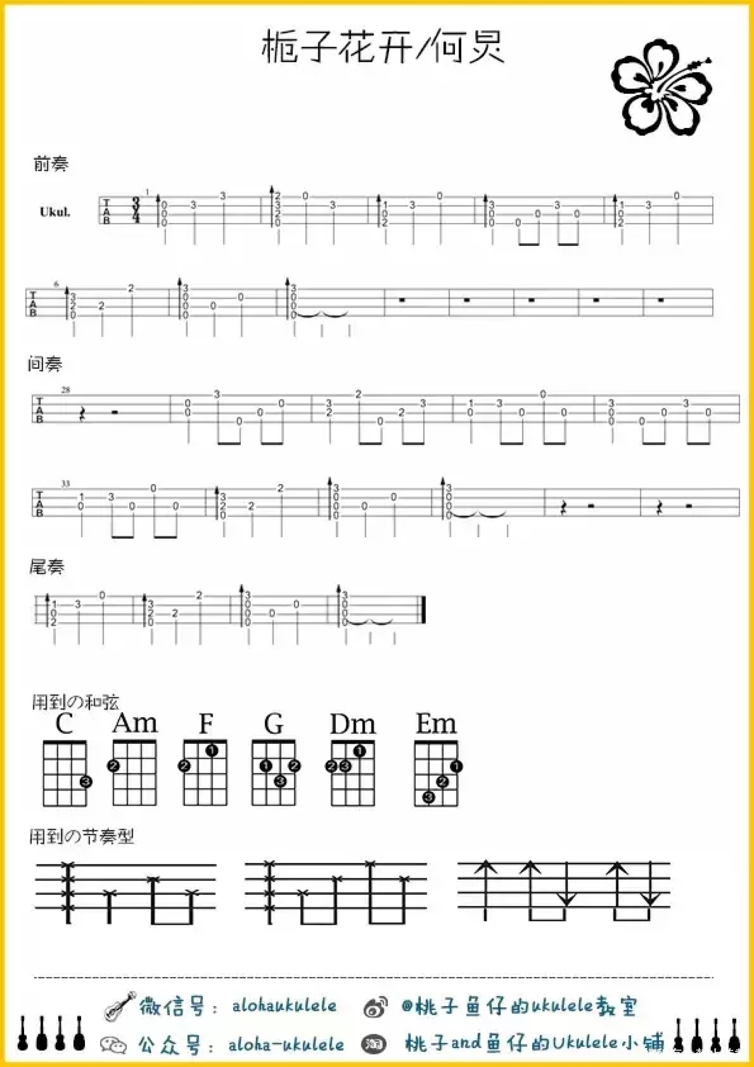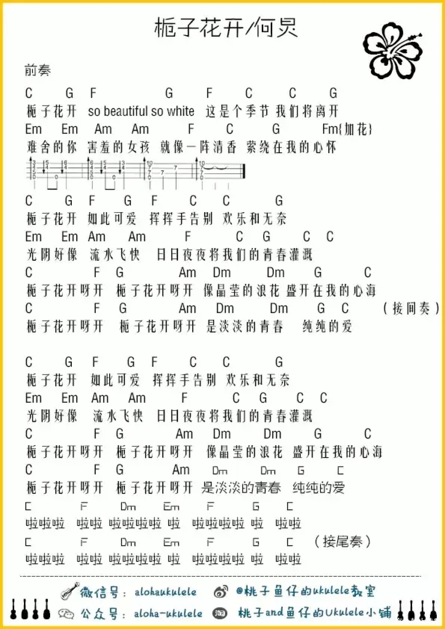 曲谱介绍: 何炅《栀子花开》_C调尤克里里谱