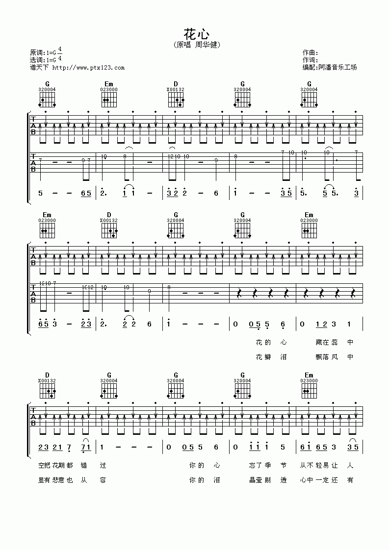 曲谱介绍: 周华健《花心》吉他弹唱谱,采用G调指法编配,共有3张高清图谱。