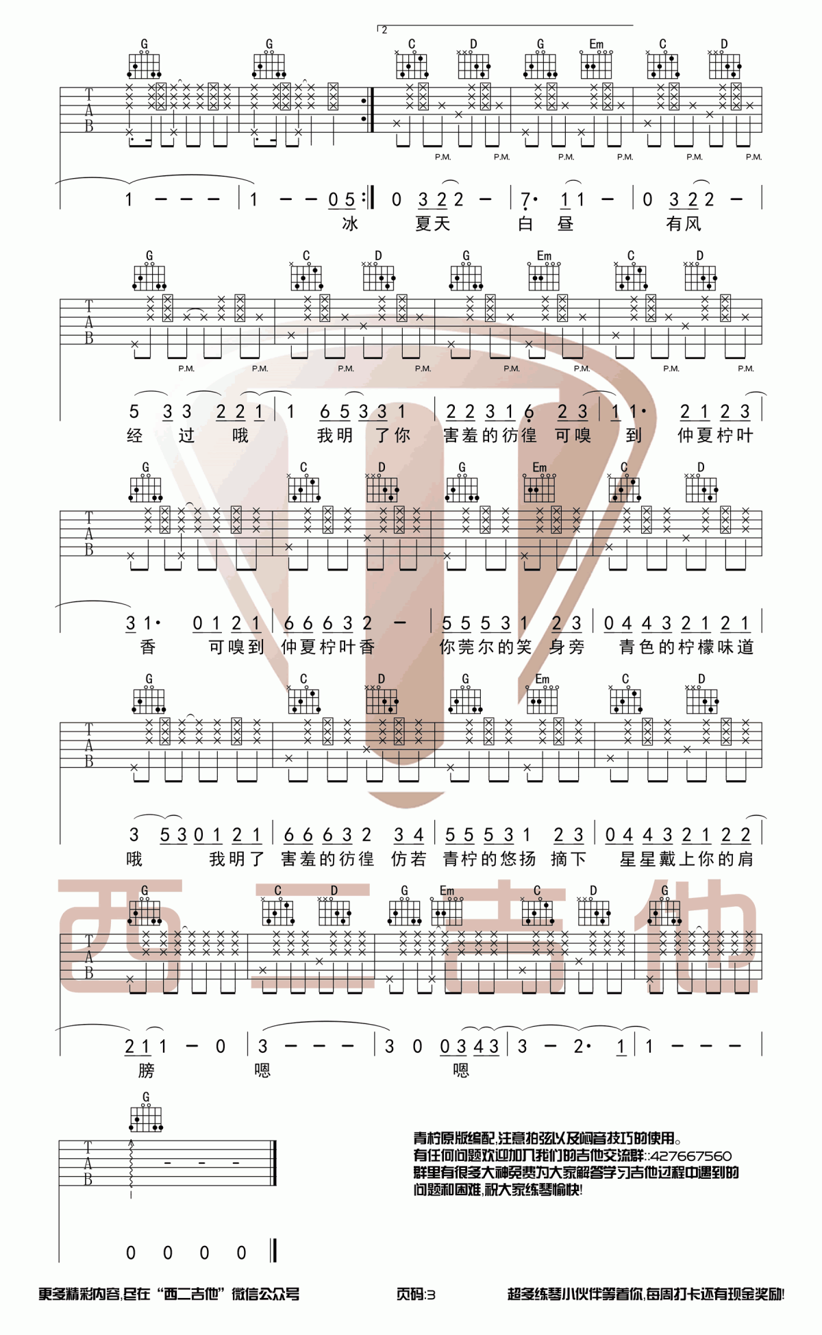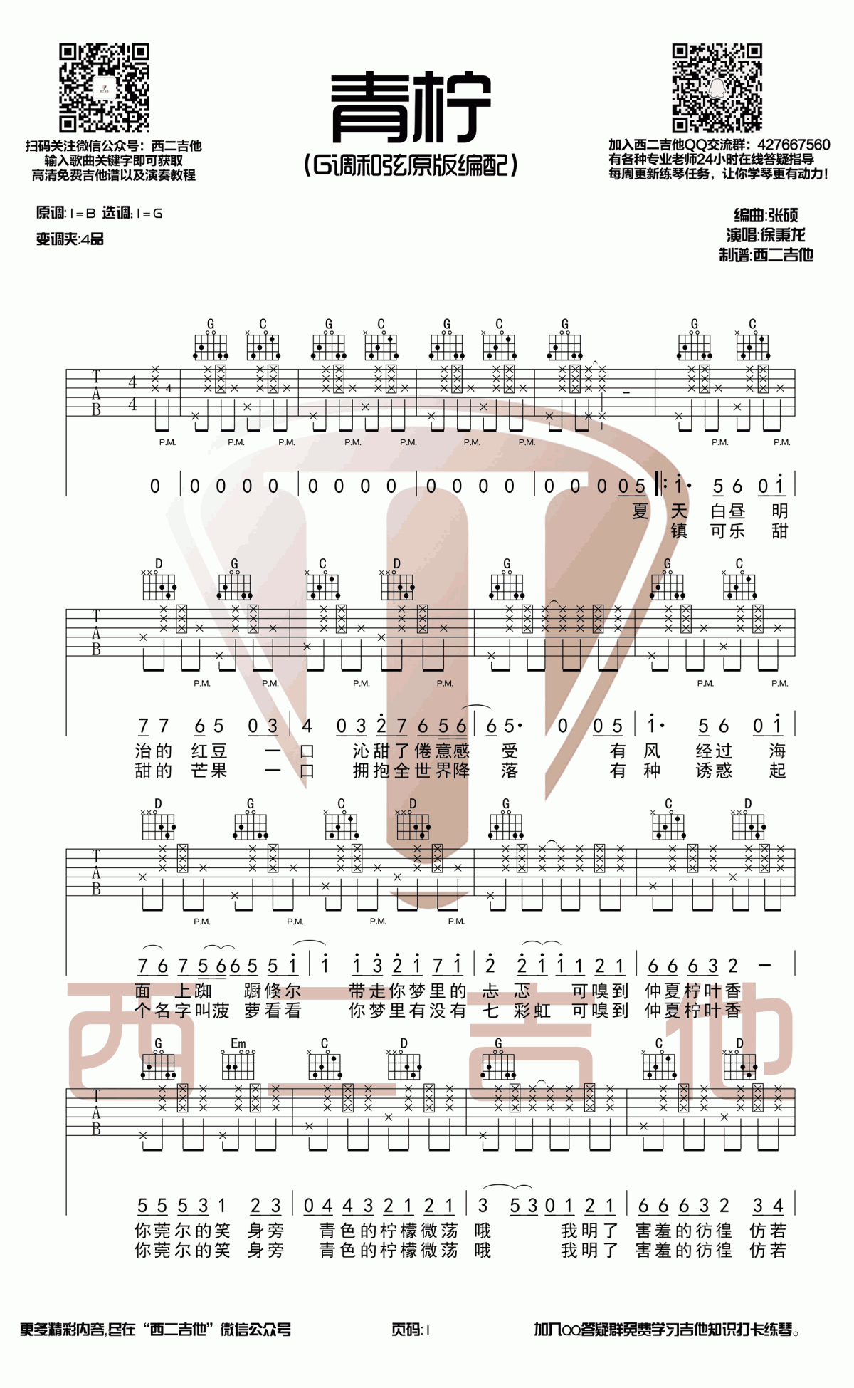 曲谱介绍: 徐秉龙《青柠》吉他弹唱谱,采用G调指法编配原版,共有3张高清图谱。