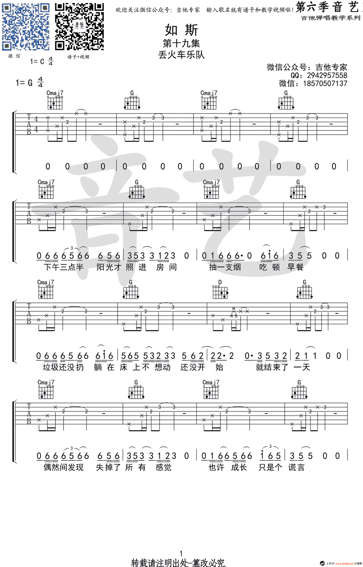 曲谱介绍: 丢火车乐队《如斯》吉他弹唱谱,采用G调指法编配,共有2张高清图谱,免翻页排版设计。