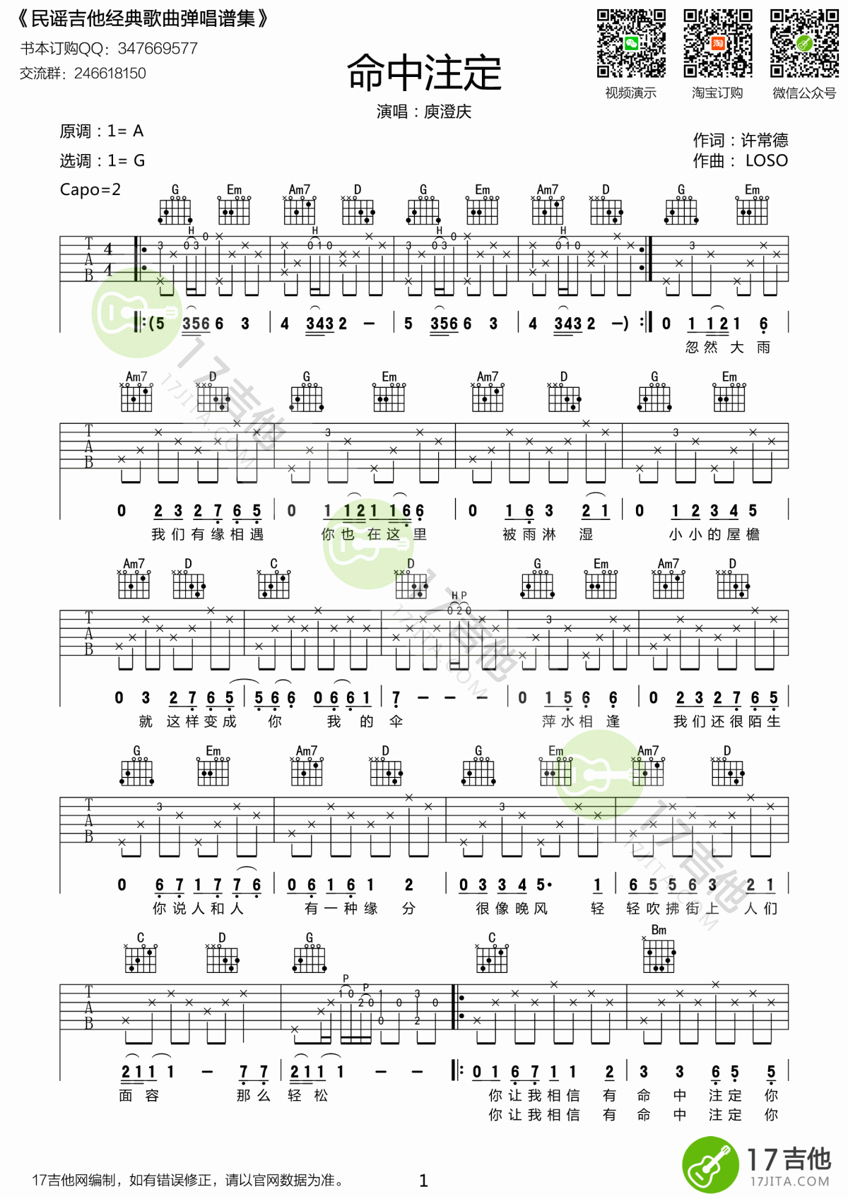 曲谱介绍: 庾澄庆《命中注定》吉他弹唱谱,采用G调指法编配,共有3张高清图谱。